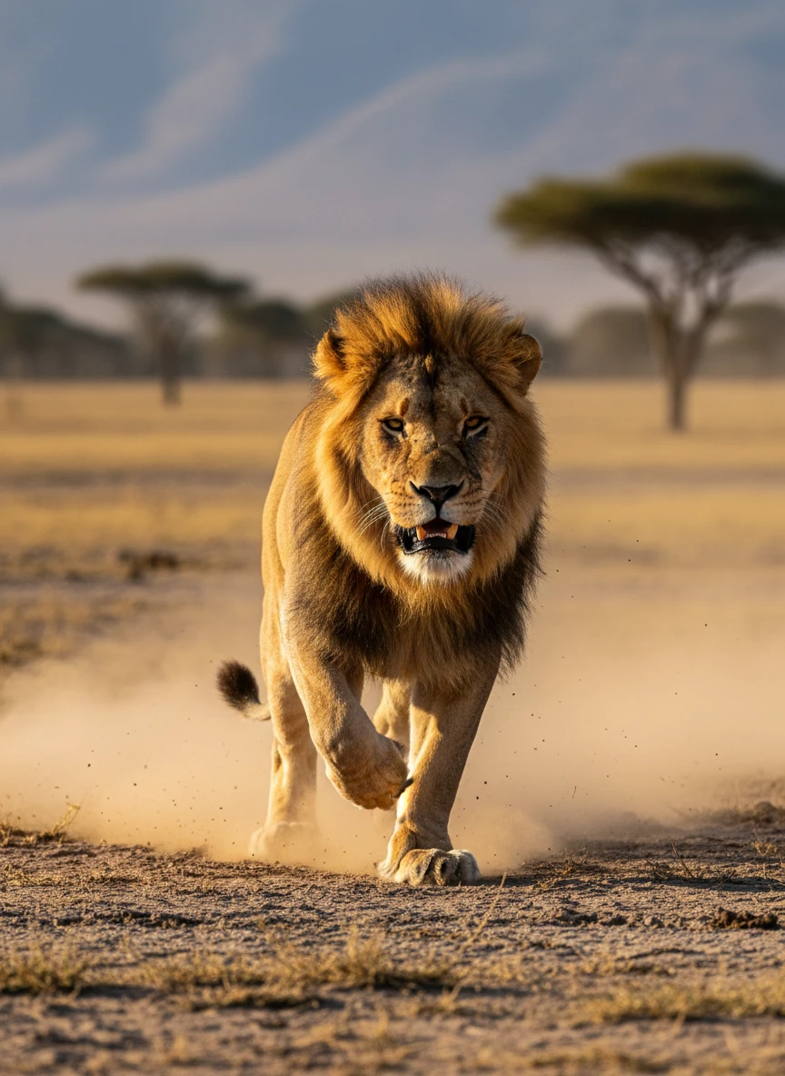 A fierce lion charging forward with intensity, dust rising around its paws in dramatic motion