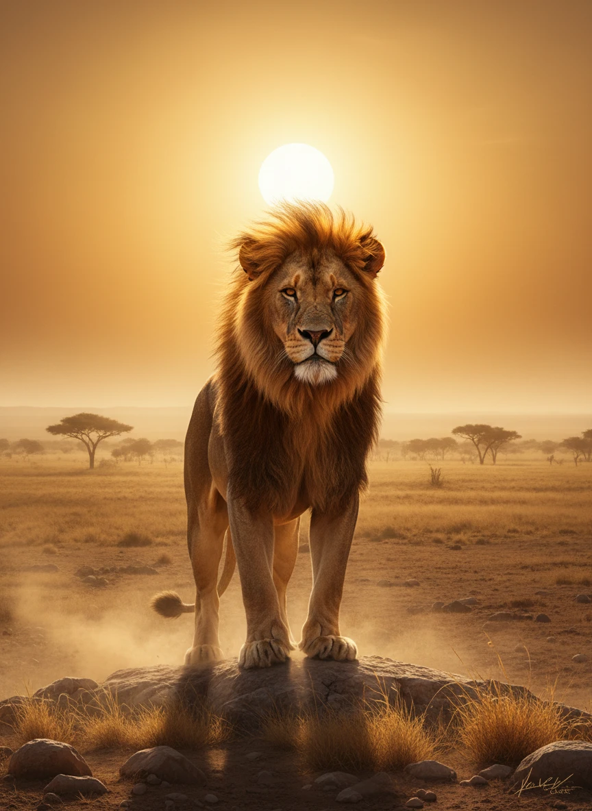 A powerful lion standing tall under the blazing sun, mane flowing in the wind across the open plains
