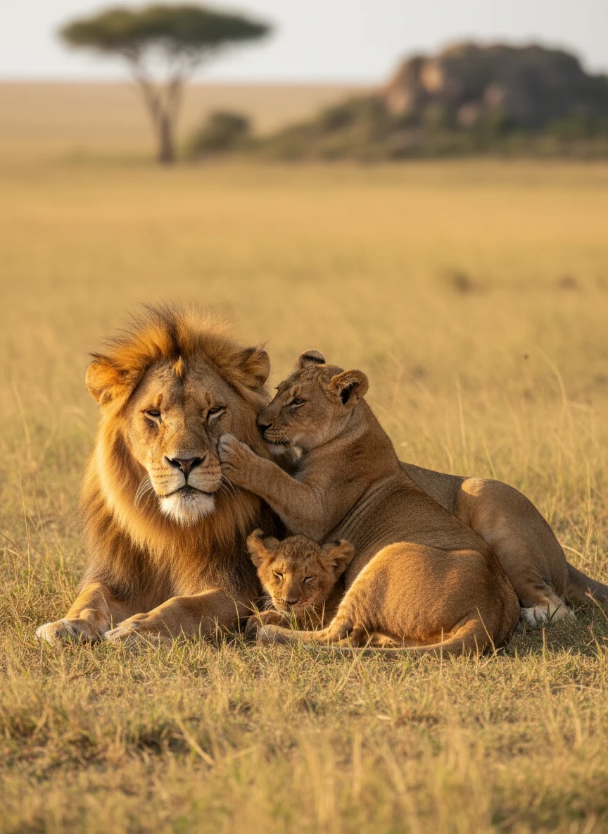 A lion family gathered closely together, cubs playfully tugging at their parents in a warm bonding moment