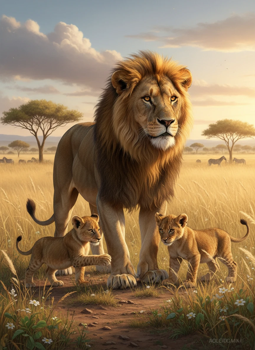 A protective lion standing beside its cubs, alert and watchful in the wild grasslands