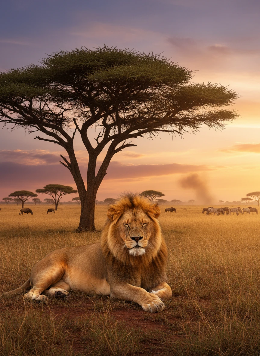 A calm lion resting beneath an acacia tree, watching over the savannah with quiet authority