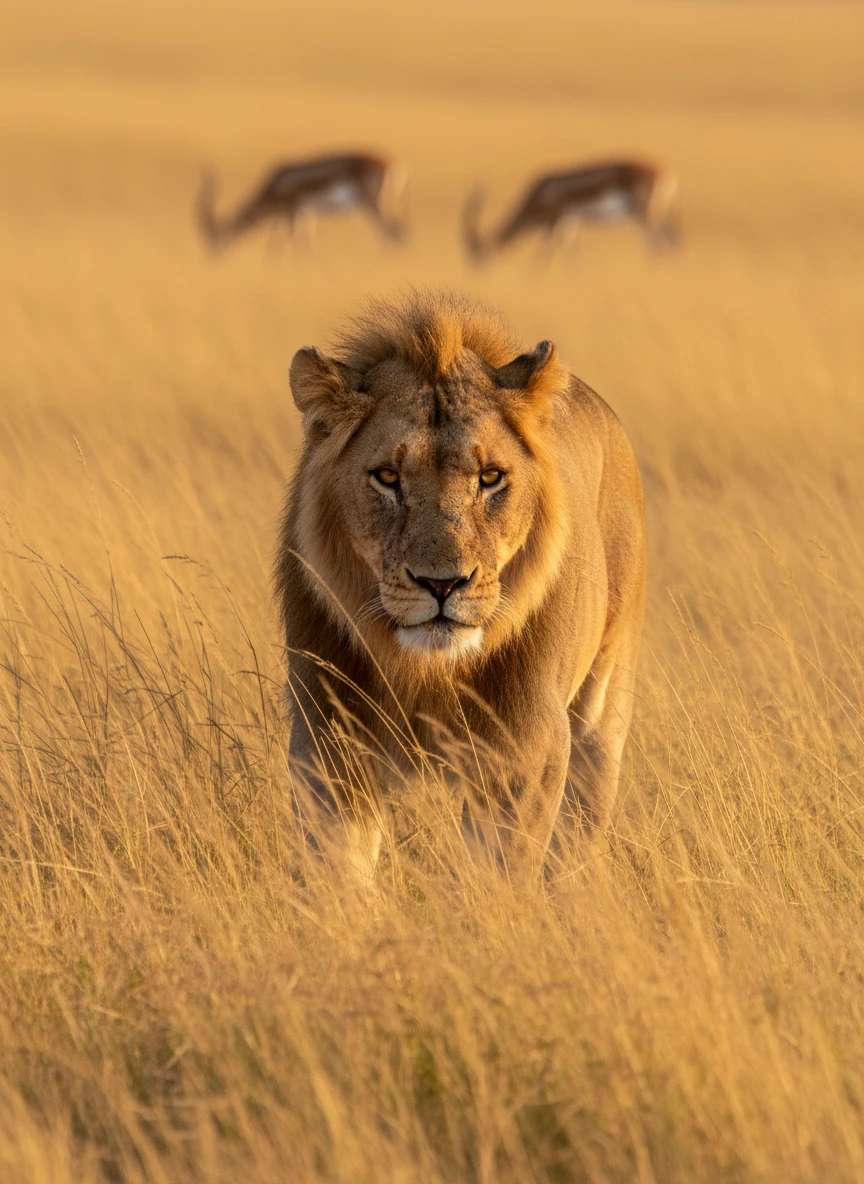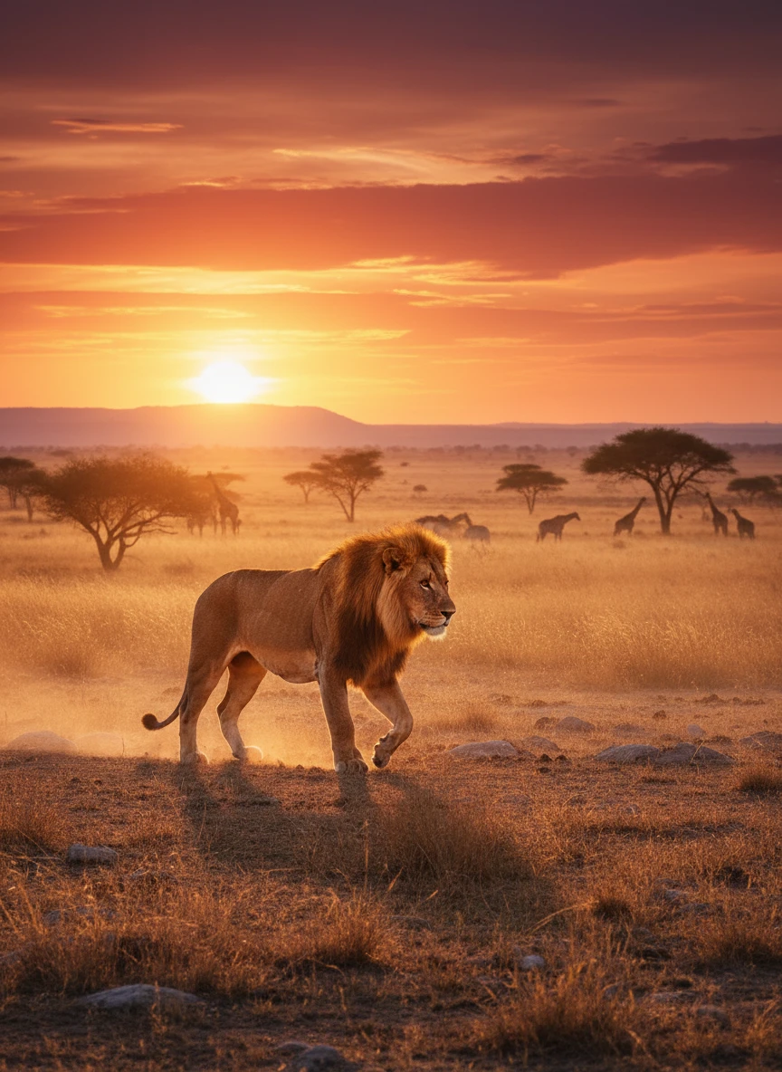A lone lion walking through the savannah at sunset, bathed in golden light and long shadows