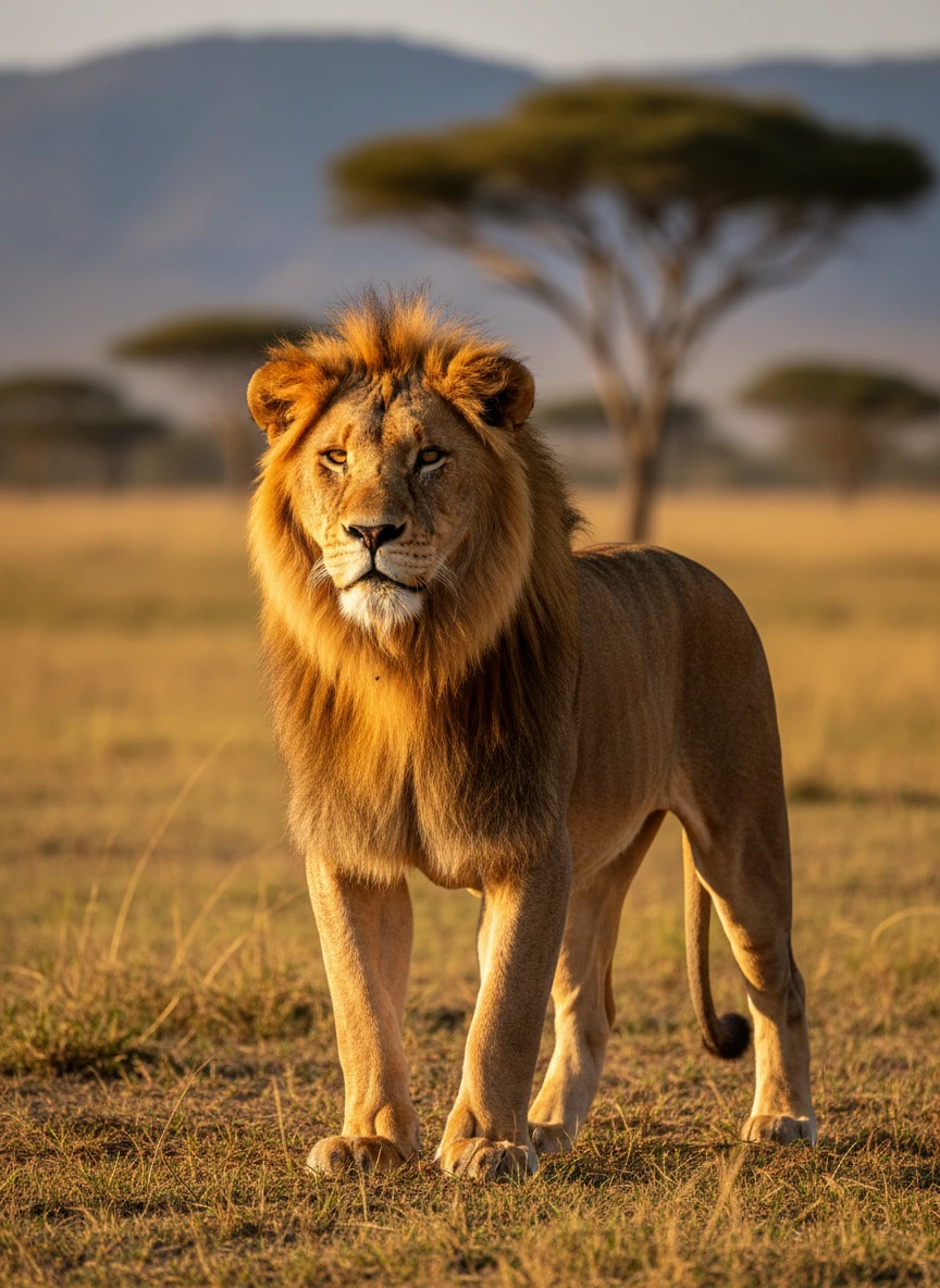 Animal generator creating a realistic African lion standing on a sunlit savanna at golden hour. Emphasize lifelike fur texture, muscular anatomy, and natural posture with a shallow depth of field. Photorealistic, wildlife, cinematic — NEG: blur, cartoon, extra limbs, distorted anatomy, watermark