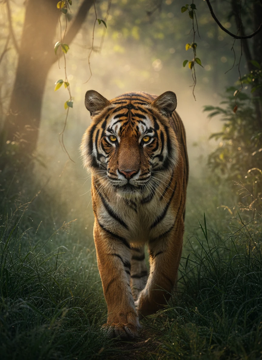 Animal generator rendering a powerful Bengal tiger walking through misty jungle grass at dawn. Highlight striped fur, piercing eyes, and cinematic lighting — NEG: cartoon style, anatomy errors, noise, text