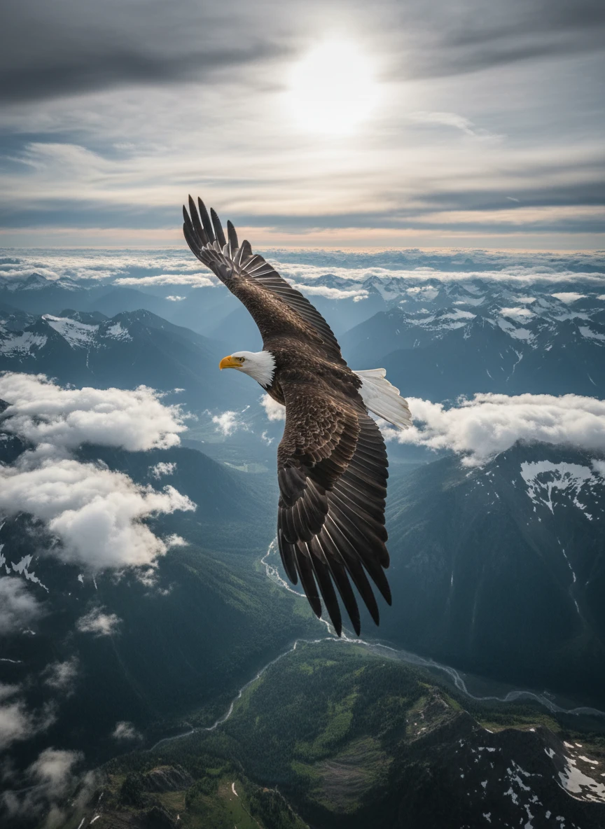 Animal generator visualizing a bald eagle soaring above mountain valleys with wings fully extended. Epic, cinematic wildlife — NEG: blurred edges, incorrect anatomy, watermark