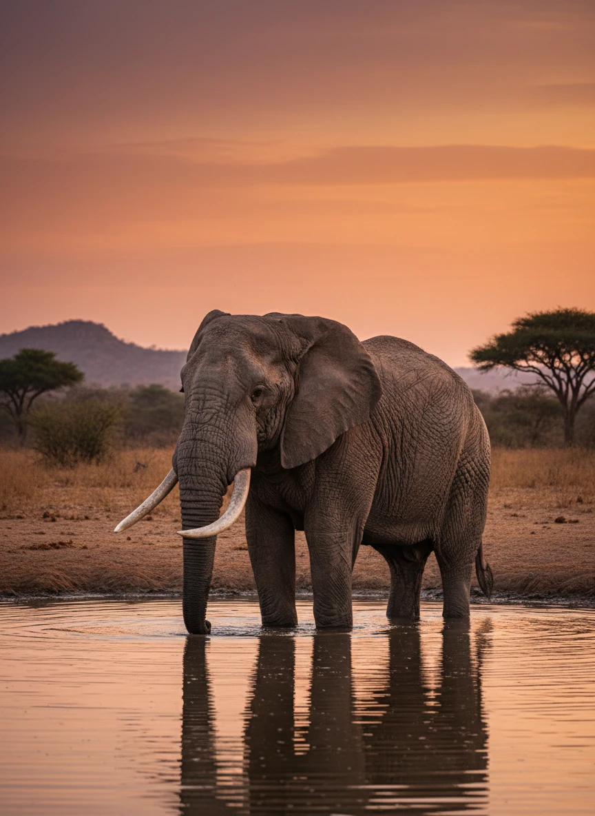 Animal generator depicting a gentle elephant near a watering hole at sunset. Show textured skin, water reflections, and warm sky tones. Naturalistic, wildlife — NEG: surreal colors, low detail, blur