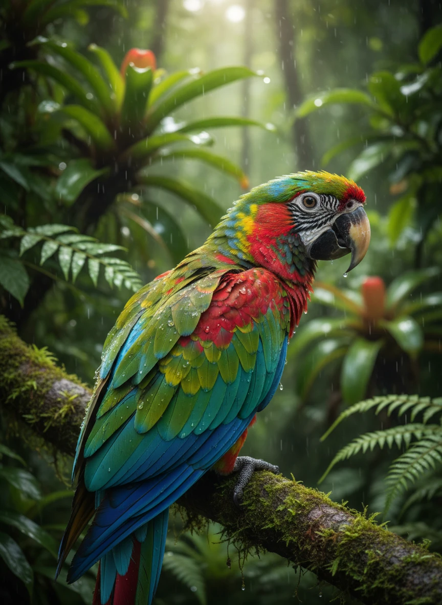Animal generator illustrating a colorful tropical parrot perched on a rainforest branch after rain. Capture saturated feathers, water droplets, and lush foliage. Ultra-detailed, vivid color — NEG: dull colors, blur, artifacts, watermark