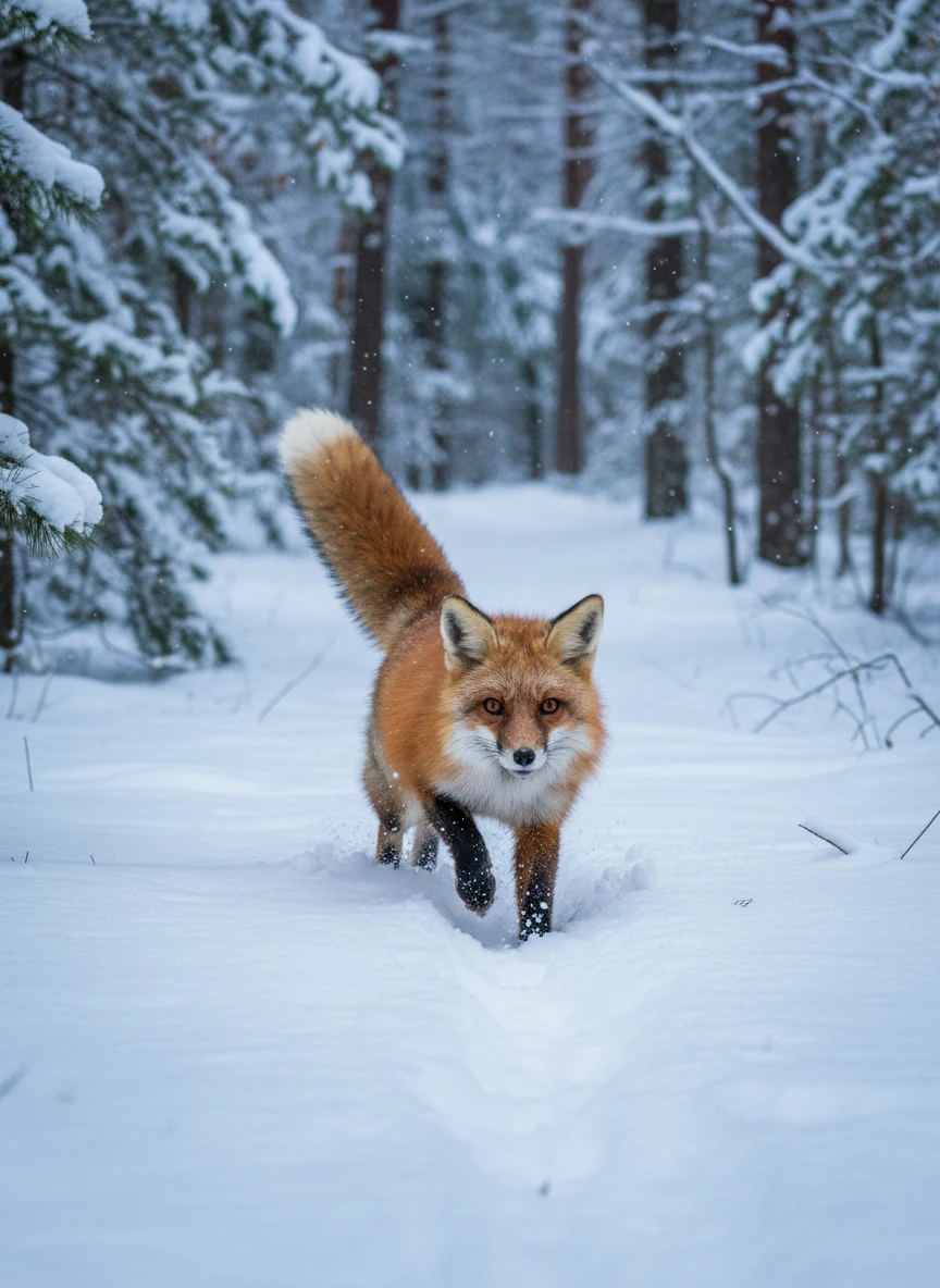 Animal generator creating a playful red fox in a snowy forest clearing. Focus on expressive eyes, fluffy tail, and fresh snow. Photorealistic, winter — NEG: unrealistic fur, low resolution, text