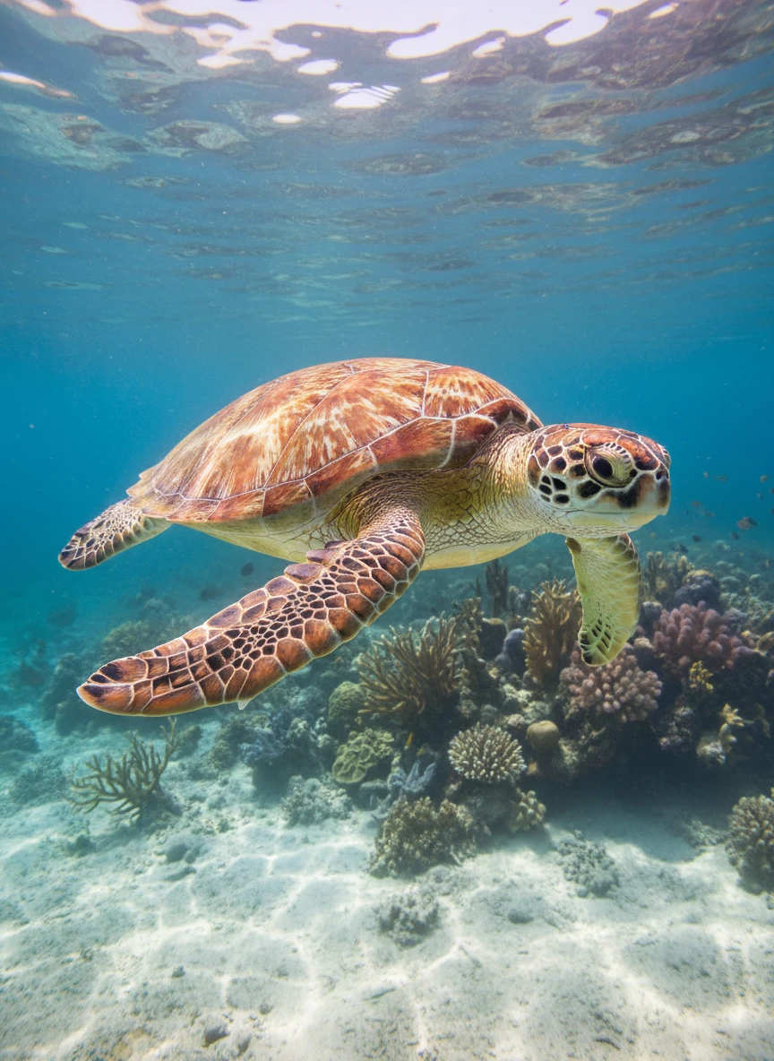 Animal generator portraying a sea turtle gliding through clear tropical water with sun rays and coral. Underwater, serene, high-detail — NEG: murky water, distorted fins, noise