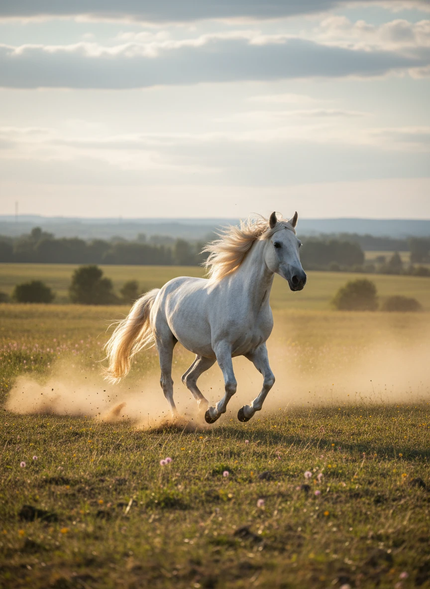 Animal generator illustrating a graceful white horse running across an open meadow. Emphasize flowing mane, motion, and natural light — NEG: extra legs, stiff pose, watermark