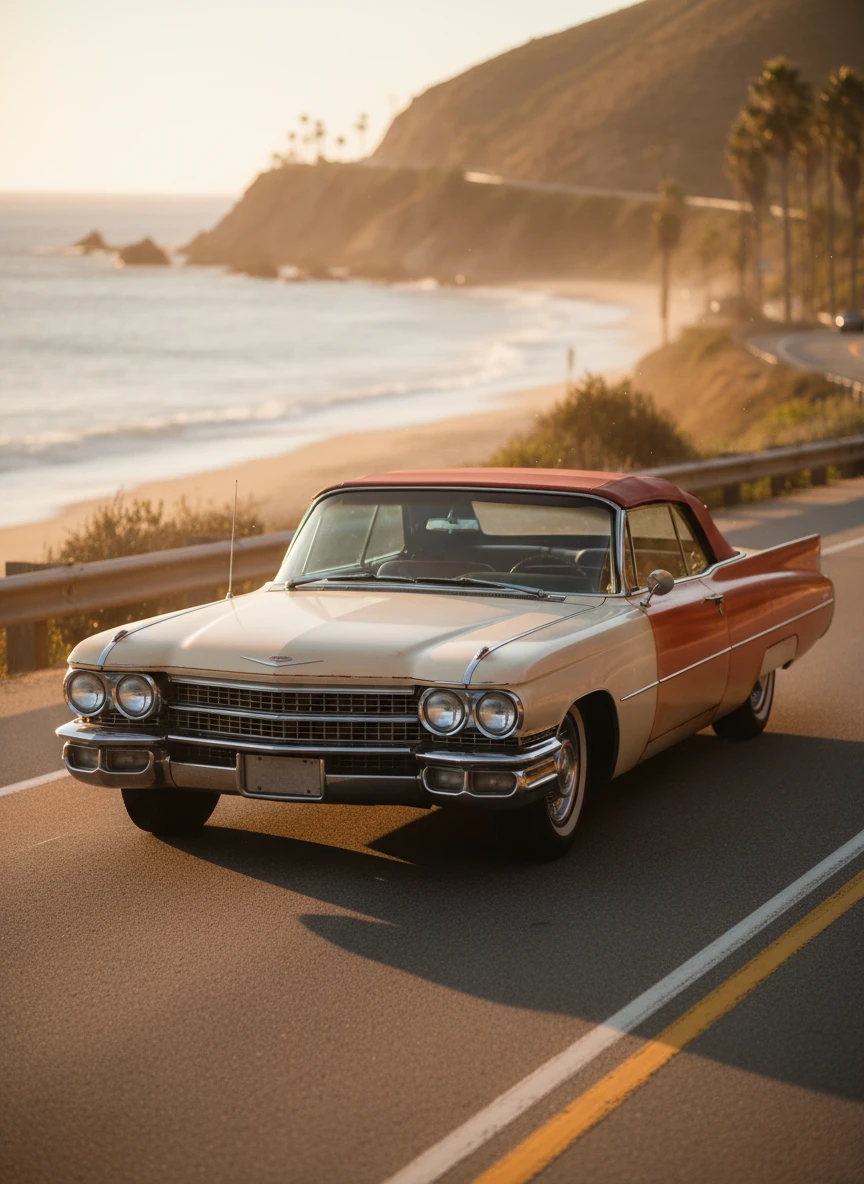 Classic Convertible Sunset imagined through a realistic car generator at golden hour near the coast. Warm sunlight glows on chrome details and weathered paint, with the ocean softly blurred behind. The mood is nostalgic yet grounded in real-world photography. photorealistic, golden-hour, classic — NEG: illustration, neon colors, plastic look, noise, vignette, watermark