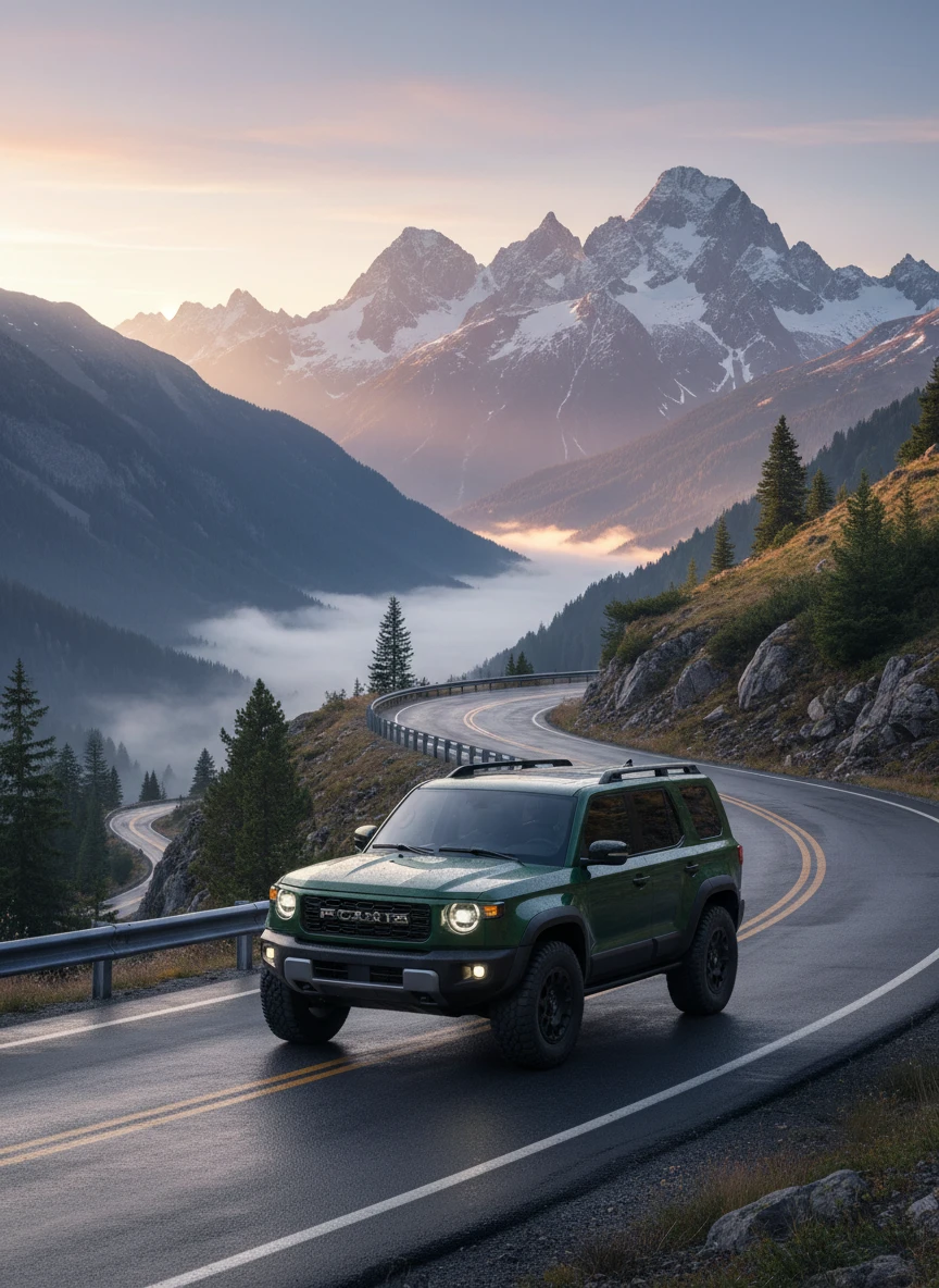 Mountain Pass SUV produced by a realistic car generator on a winding alpine road. The vehicle is shown in crisp morning light with misty mountains in the background and realistic tire grip on asphalt. Natural colors and scale reinforce authenticity. photorealistic, landscape, adventure — NEG: fantasy, sci-fi, oversaturated, flat lighting, distortion, watermark