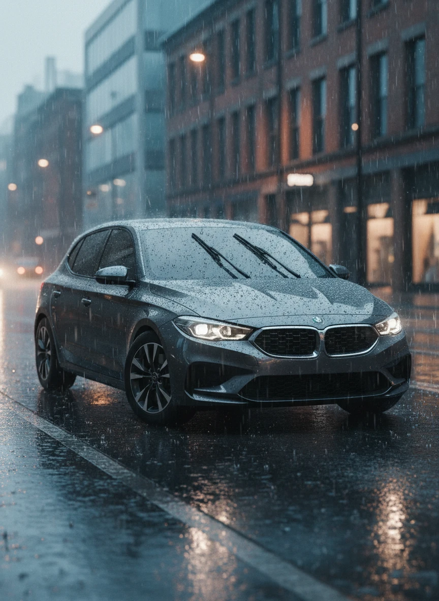 Rainy Street Hatchback created with a realistic car generator during an overcast evening drizzle. Raindrops bead naturally on the car’s surface while streetlights cast warm reflections on the wet road. Proportions and materials remain true-to-life. photorealistic, moody, street — NEG: cartoonish, surreal, exaggerated shapes, blur, banding, watermark