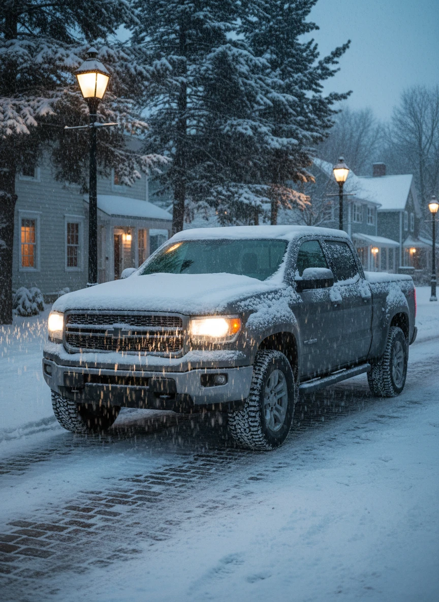 Snowy Night Pickup generated by a realistic car generator in a quiet winter town. Snow accumulates naturally on the hood and roof while headlights cut through falling flakes. Accurate lighting and textures maintain realism. photorealistic, winter, night — NEG: cartoon, low-res, fake snow, motion smear, artifacts, watermark