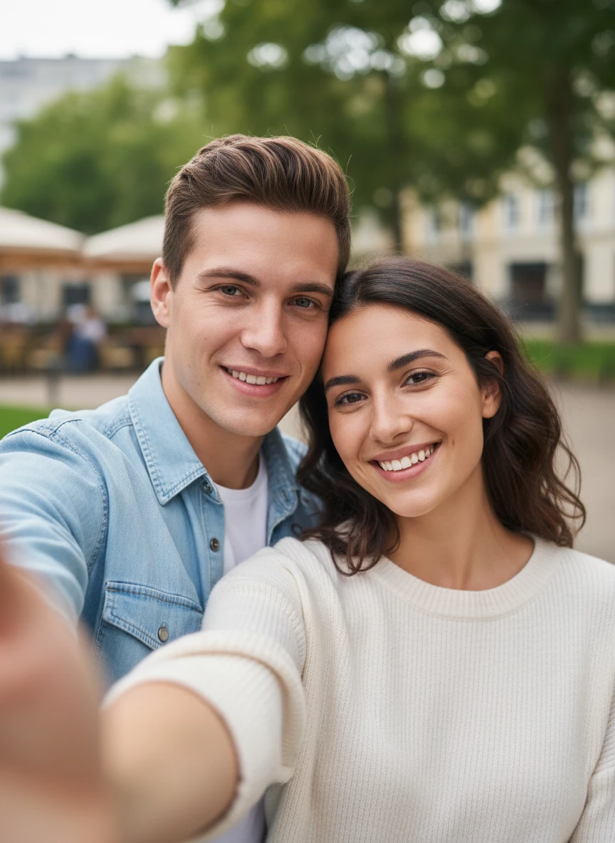 AI Couple Generator depicting a modern couple selfie-style portrait as if taken on a smartphone. The image feels casual, friendly, and authentic, with balanced lighting and realistic facial details. The couple appears relaxed and naturally connected. selfie perspective, modern realism, casual vibe NEG: fisheye distortion, heavy filters, motion blur, unnatural skin, misaligned eyes