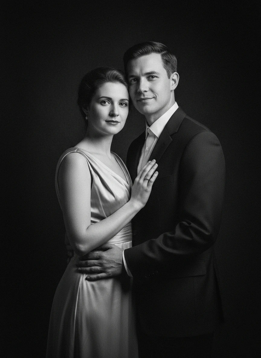 AI Couple Generator crafting a timeless black-and-white couple portrait that highlights emotion, contrast, and intimacy. The couple’s expressions are calm and confident, with classic photographic composition. The mood feels elegant and everlasting. black and white, classic portrait, high contrast NEG: flat lighting, grain overload, harsh noise, ghosting, washed-out tones