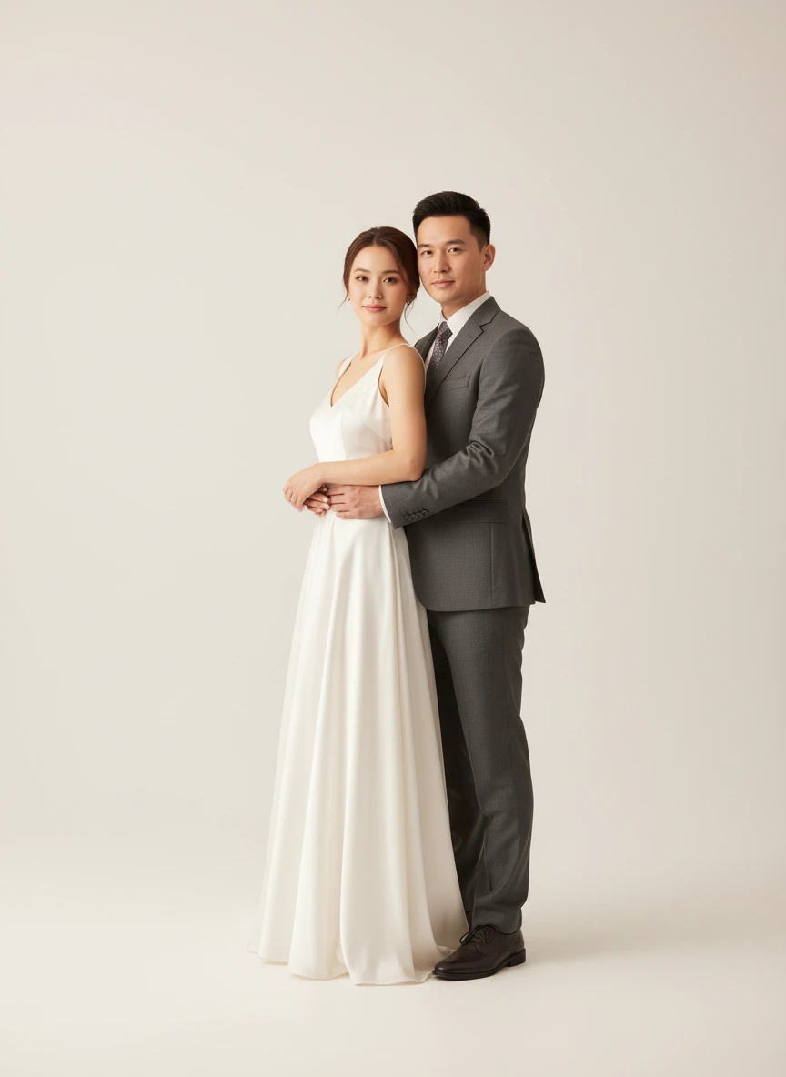 AI Couple Generator creating an elegant couple portrait with soft studio lighting and a clean, minimal backdrop. The couple stands close, conveying confidence, trust, and affection through subtle expressions. The composition feels balanced and refined. studio portrait, minimal background, soft light NEG: harsh flash, flat faces, color casts, uneven exposure, noise