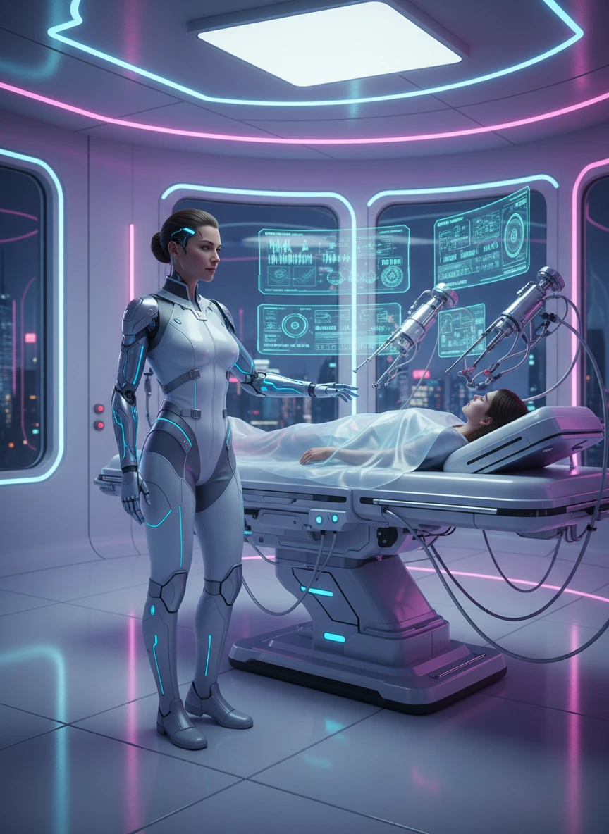 Use the Cyberpunk Character Generator to show a cyber-enhanced medic in a neon-lit clinic. Transparent displays show vitals as robotic tools hover near the patient bed. The character’s expression is calm, precise, and humane. sci-fi medical, clean, dramatic — NEG: gore, horror style, dark shadows, bad anatomy, cluttered UI, noise
