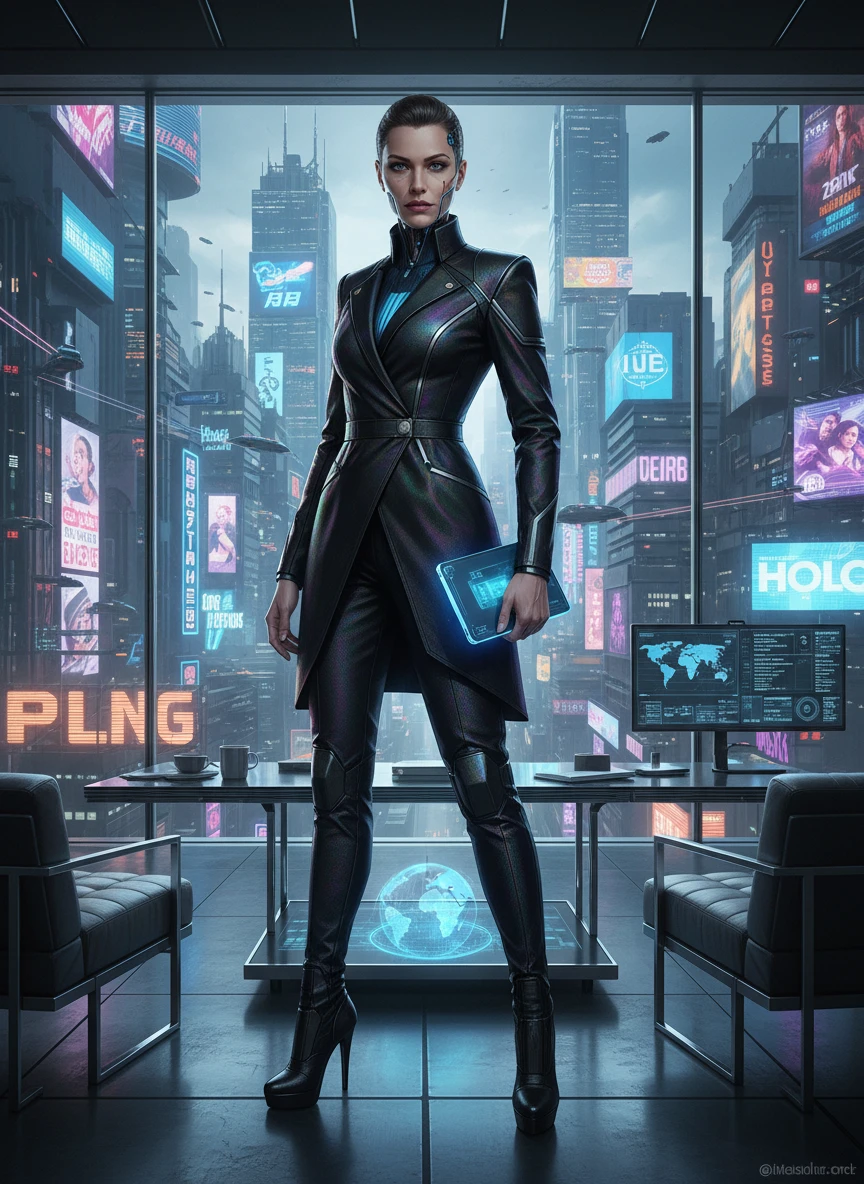 Using the Cyberpunk Character Generator, portray a powerful corporate executive enhanced with subtle cybernetics. The character stands in a glass skyscraper office overlooking a neon skyline, dressed in sharp futuristic fashion. Cold lighting and precise details convey control and authority. sleek, high-tech, dystopian — NEG: casual clothing, medieval style, soft focus, noisy image, exaggerated proportions, logo text