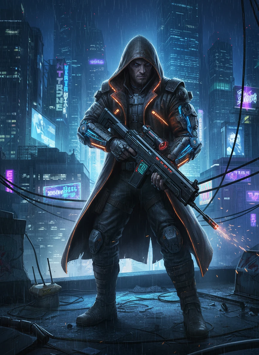 Generate a lone bounty hunter through the Cyberpunk Character Generator, standing on a rooftop at night with a glowing city below. Heavy cybernetic arms and a smart weapon suggest experience and danger. Wind and neon lights add motion and drama. action sci-fi, cinematic, gritty — NEG: motion blur, oversaturation, fantasy weapons, extra limbs, face distortion, watermark