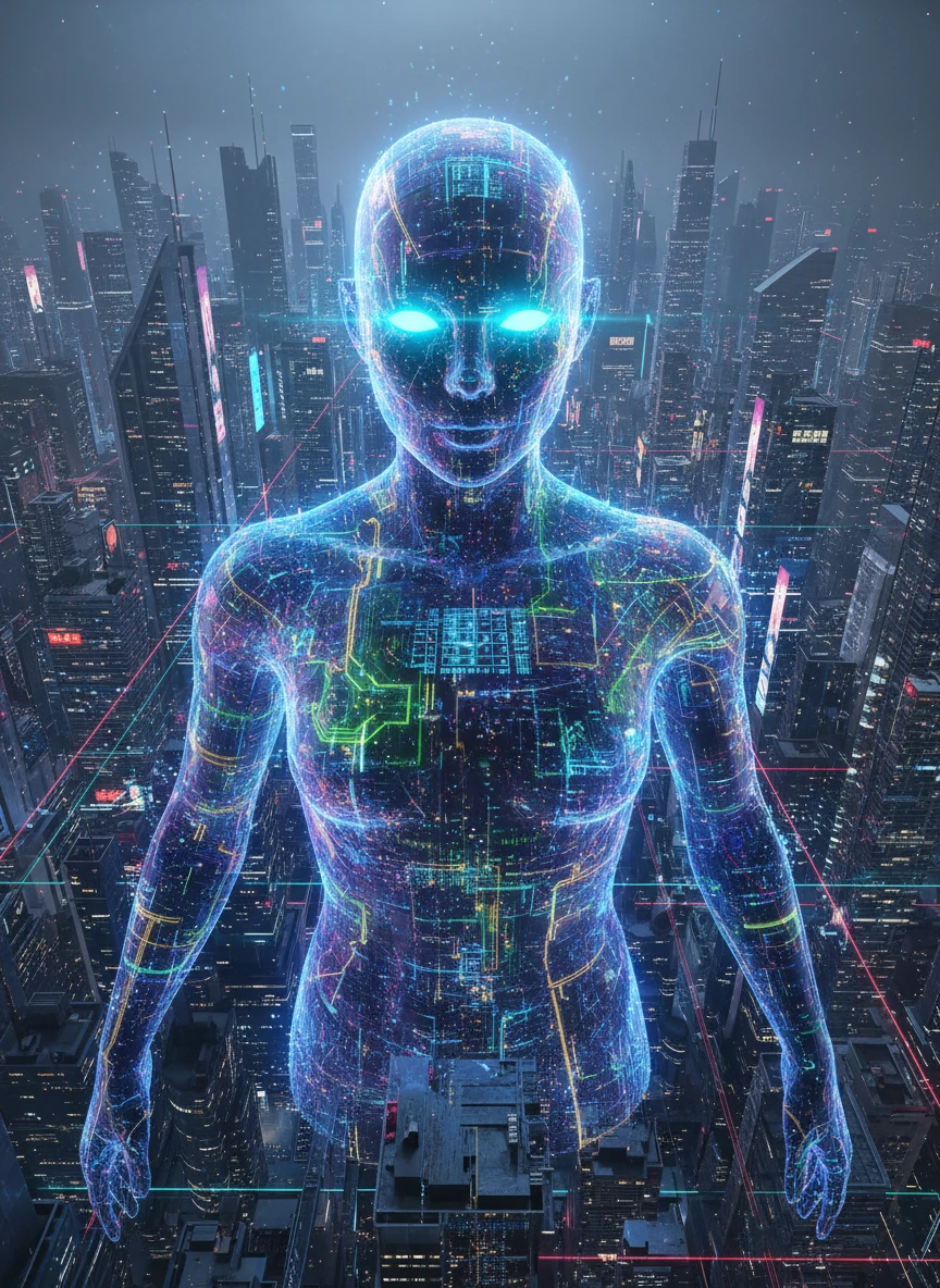 Design a mysterious AI avatar with the Cyberpunk Character Generator, appearing as a semi-transparent humanoid formed from light and code. The figure floats within a digital cityscape, eyes glowing with intelligence. The mood is ethereal and powerful. digital sci-fi, abstract, neon — NEG: solid realism, fantasy magic, low detail, pixel noise, asymmetrical face, text overlay