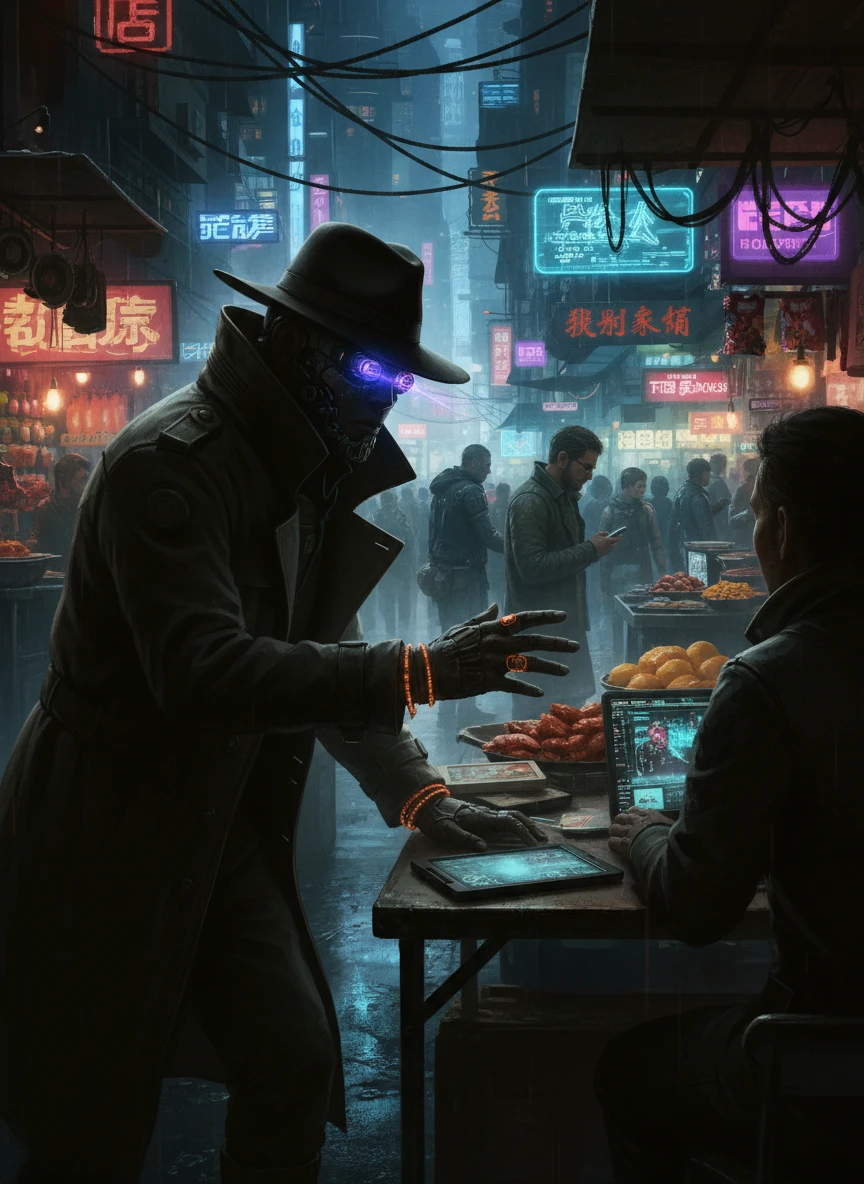 With the Cyberpunk Character Generator, depict a shadowy fixer negotiating deals in a crowded night market. Cybernetic eyes scan the crowd while augmented jewelry glows subtly. The environment feels dense, urban, and dangerous. urban noir, detailed, atmospheric — NEG: empty background, flat shading, cartoon style, low contrast, warped perspective, blur