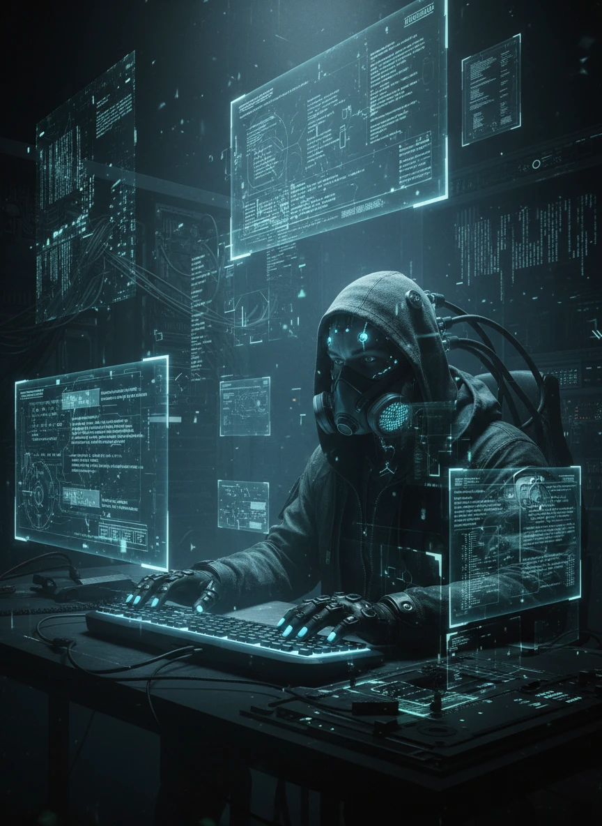 Design a high-tech hacker with the Cyberpunk Character Generator, seated in a dark room filled with floating data streams and holographic code. Neural implants glow softly as cables connect to a cyberdeck. The atmosphere feels tense and intelligent, focused on digital dominance. tech noir, holographic, moody — NEG: overexposed, messy background, bad anatomy, duplicated hands, pixelation, text artifacts