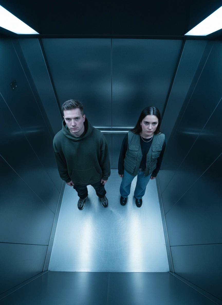 Overhead angle elevator photo two people realistic brushed metal walls cold ambient light neutral expression photorealistic cinematic street style