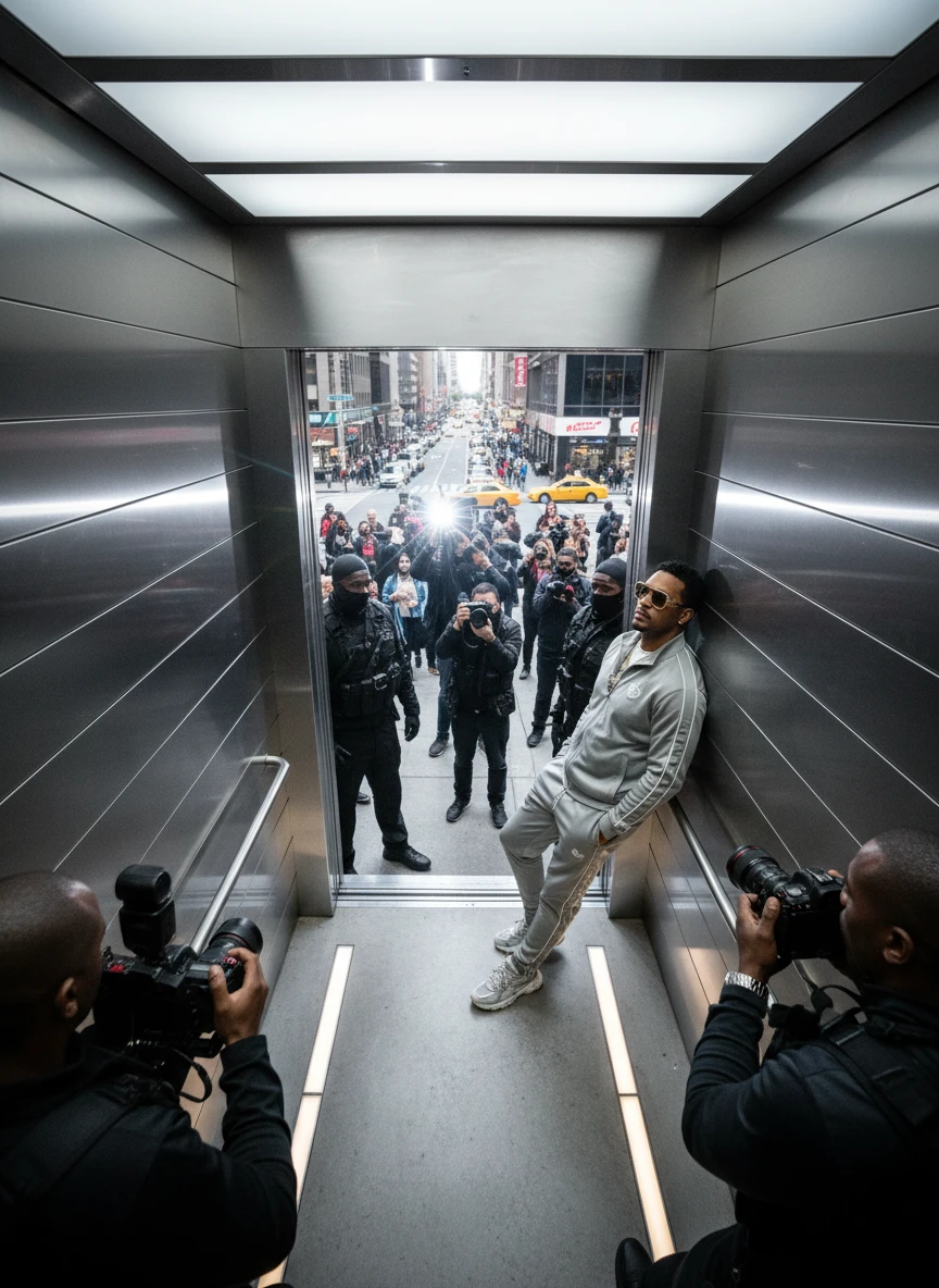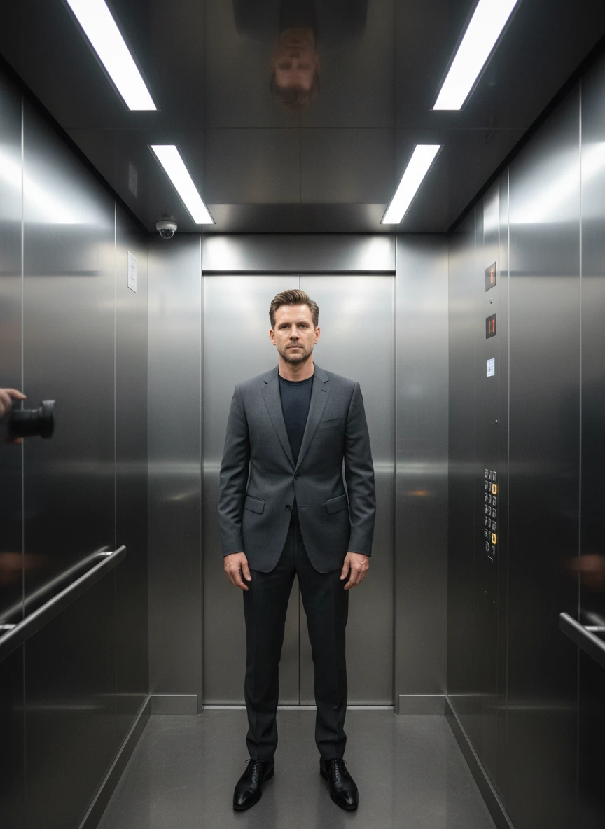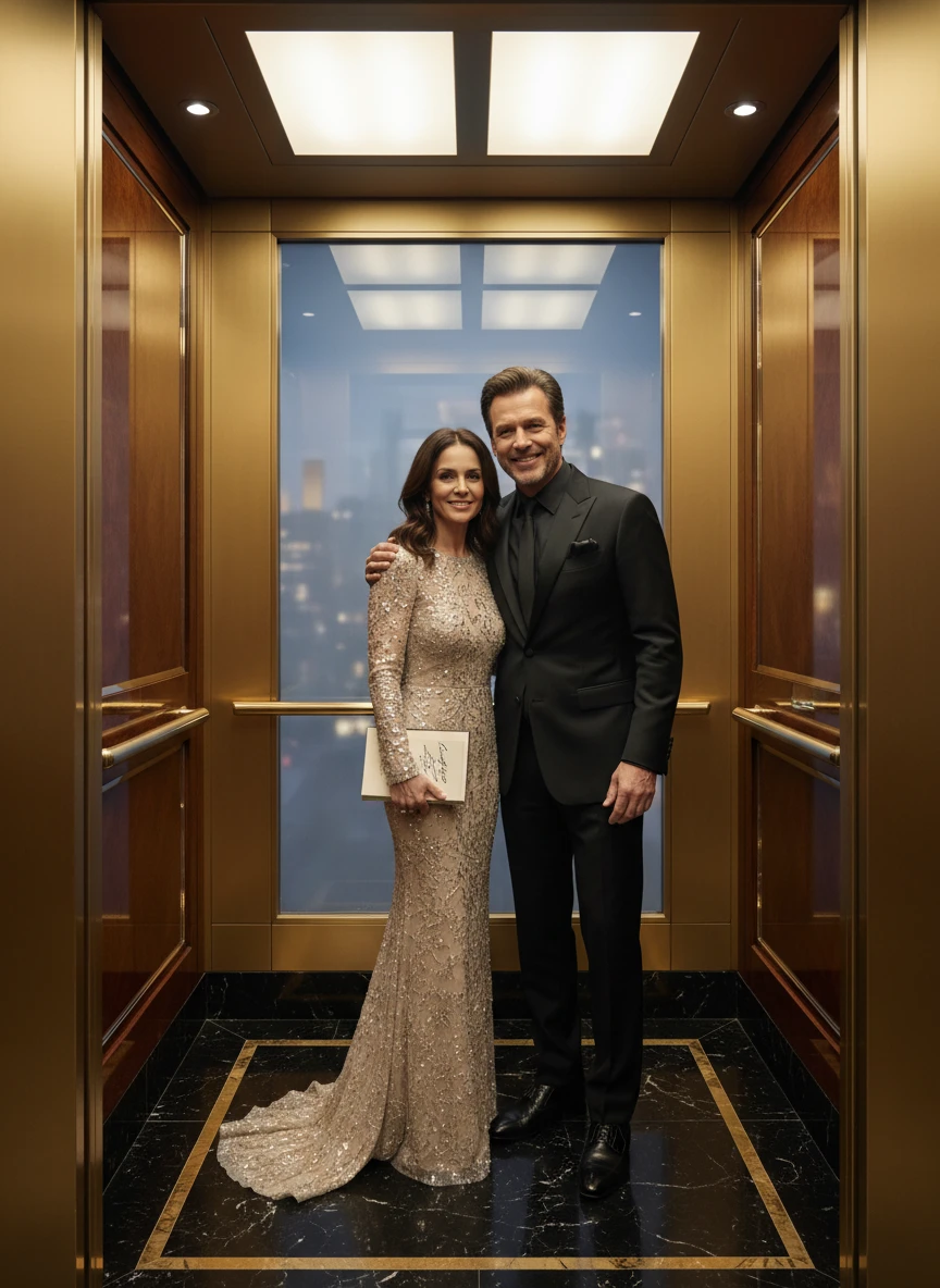 Standing close elevator photo with celebrity realistic luxury elevator editorial lighting