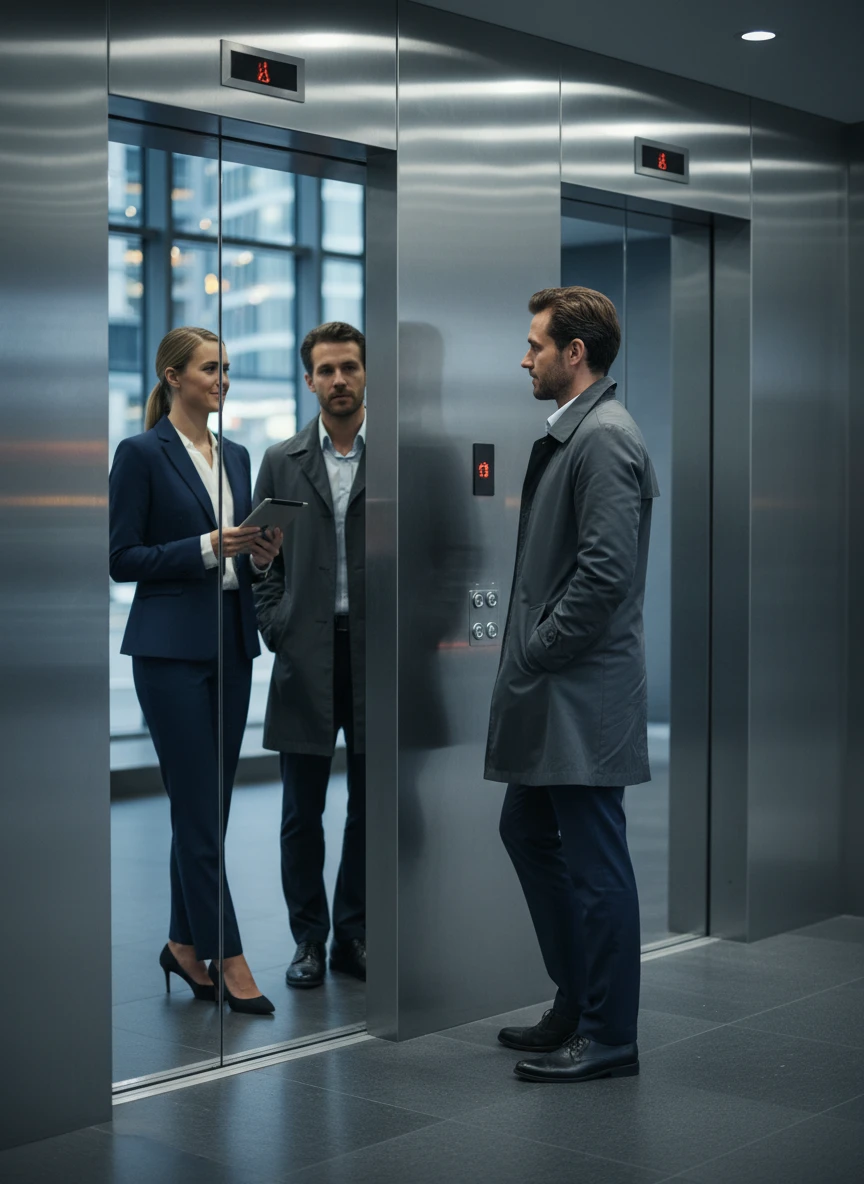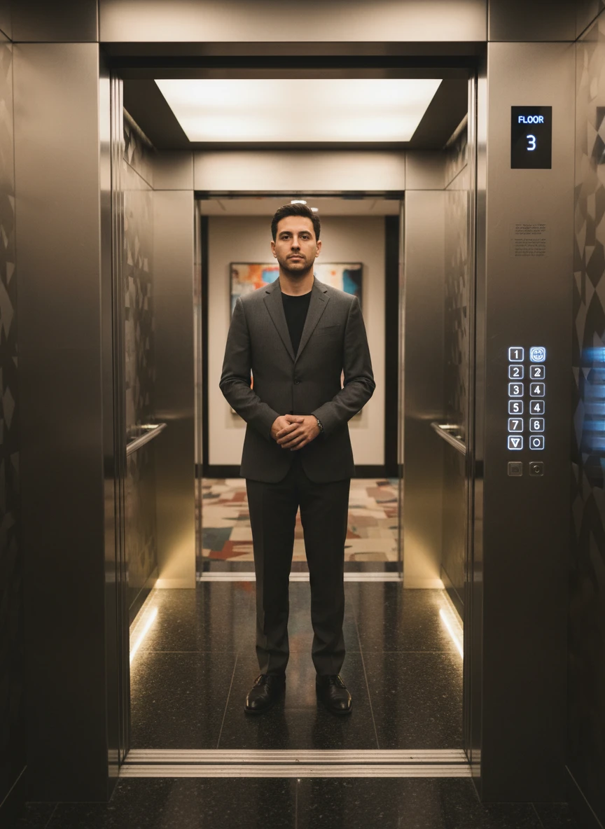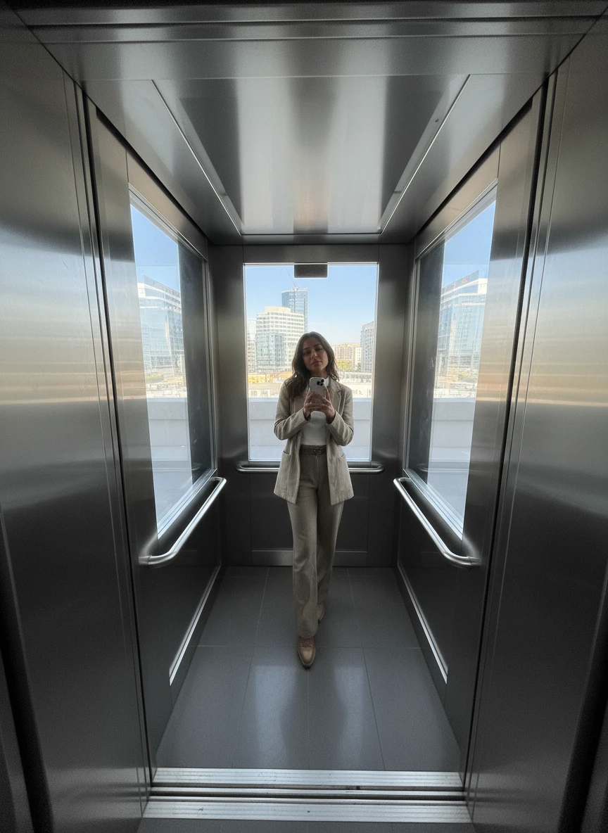 Realistic elevator photo with person eye level metal walls soft ambient light cinematic