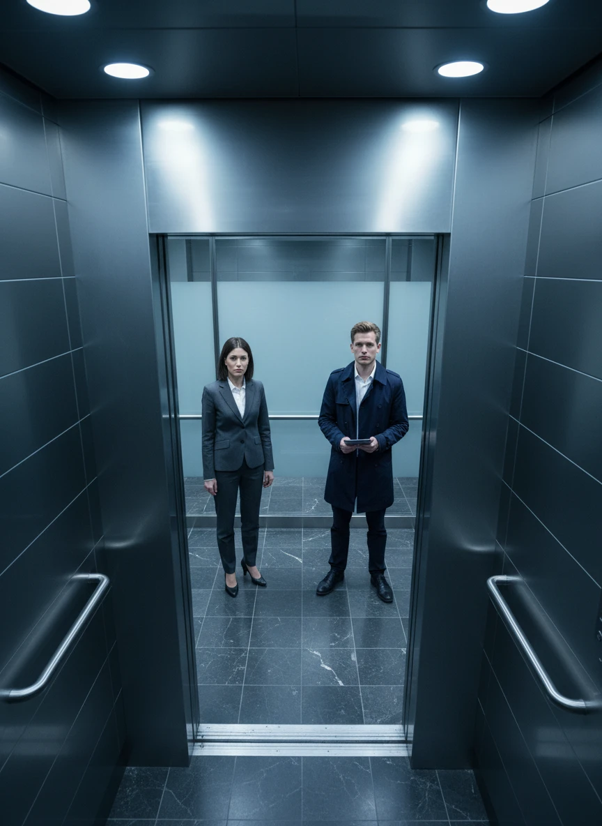 Overhead angle elevator photo two people realistic brushed metal walls cold ambient light neutral expression photorealistic