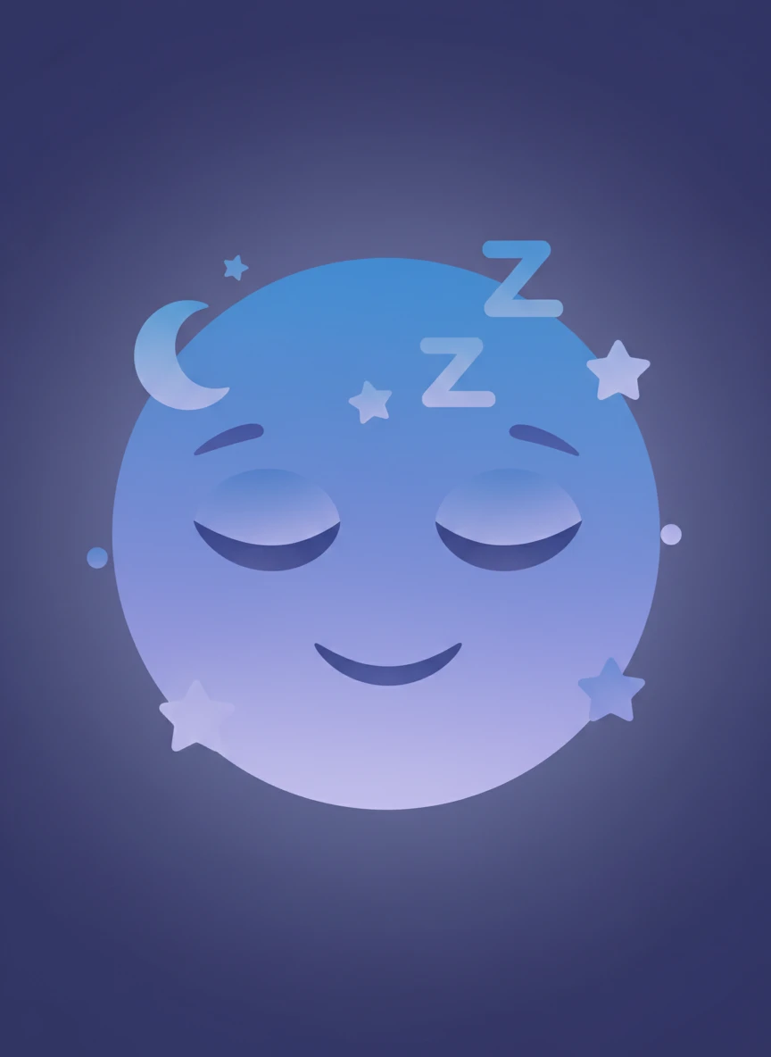 Create a calm, sleepy expression using an emoji generator, with closed eyes and relaxed features. Cool blues and purples with soft shading should suggest nighttime and rest. Keep the composition simple and soothing. calm, night-themed, soft — NEG: bright neon, realism, busy patterns, sharp noise, text