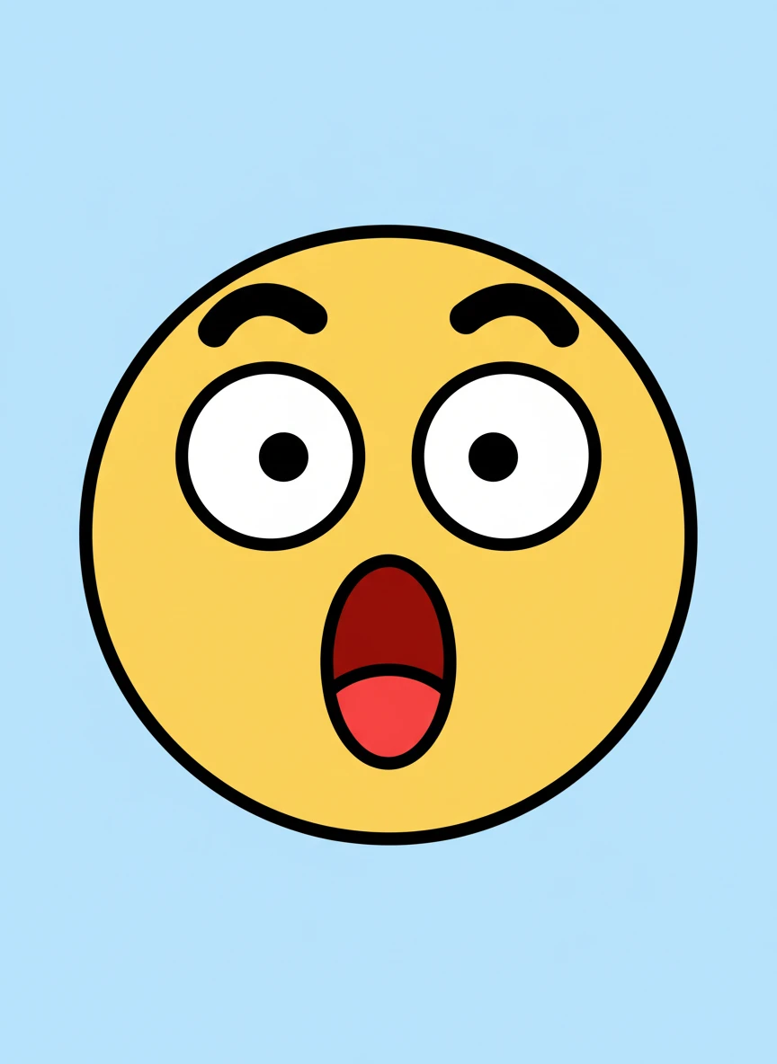 Generate a wide-eyed surprised face through an emoji generator, emphasizing open mouth and lifted brows. Use clear shapes and high contrast to capture sudden emotion. The design should feel playful rather than frightening. playful, clear, expressive — NEG: horror elements, realism, clutter, dark shadows, text