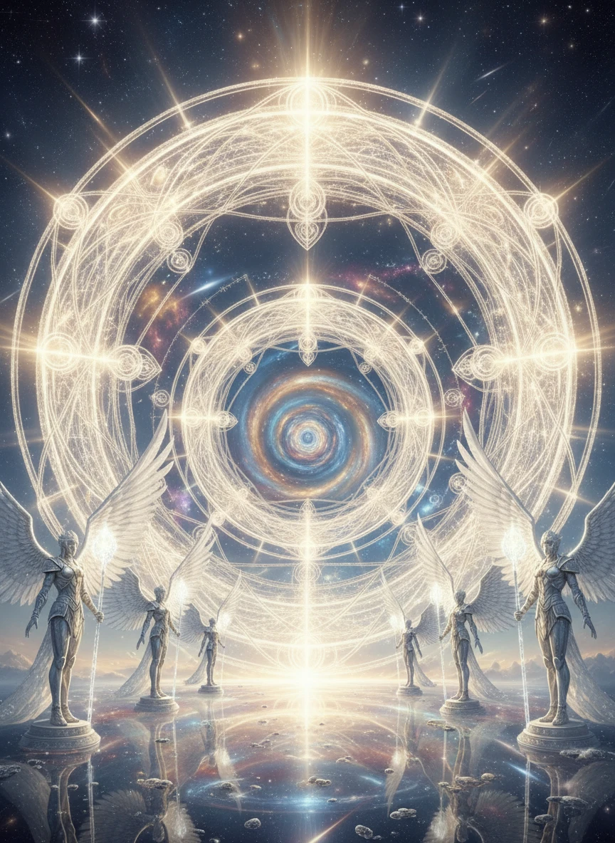 A radiant gateway floats in the heavens, forged from light, constellations, and divine geometry. Created for a fantasy-art generator, the scene conveys awe, purity, and cosmic grandeur. Winged guardians stand watch as galaxies spiral beyond the arch. celestial fantasy, luminous, grand scale — NEG: dark noise, muddy colors, low detail, asymmetry errors, blur, logo, watermark