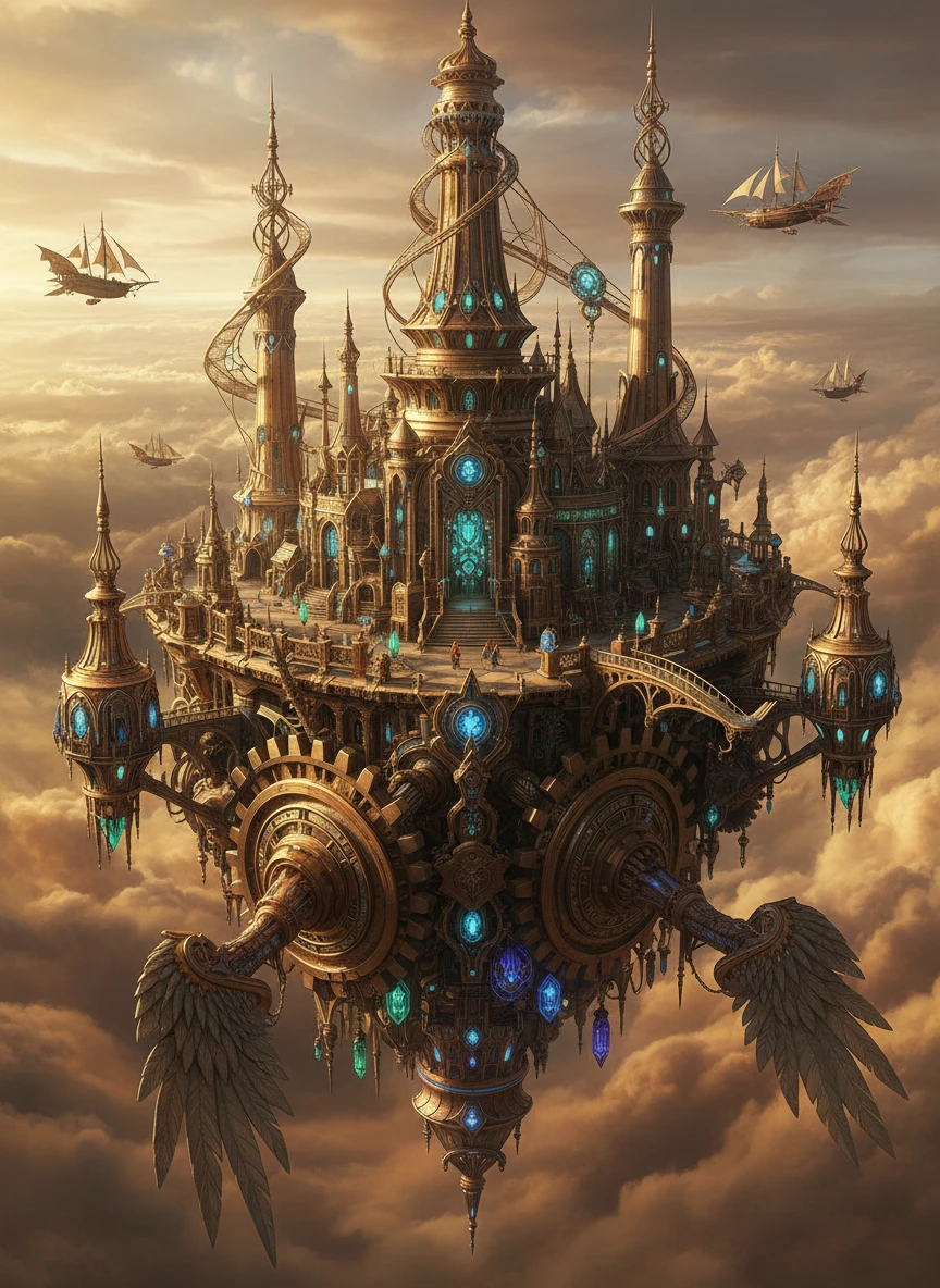 A floating fantasy city powered by gears and arcane crystals drifts through amber clouds. This fantasy-art generator scene merges magic and machinery with ornate detail and adventurous mood. Airships glide between brass towers as glowing sigils power massive clockwork wings. steampunk fantasy, intricate detail, cinematic — NEG: realism-only style, rust blur, low resolution, crooked geometry, clutter, artifacts, text