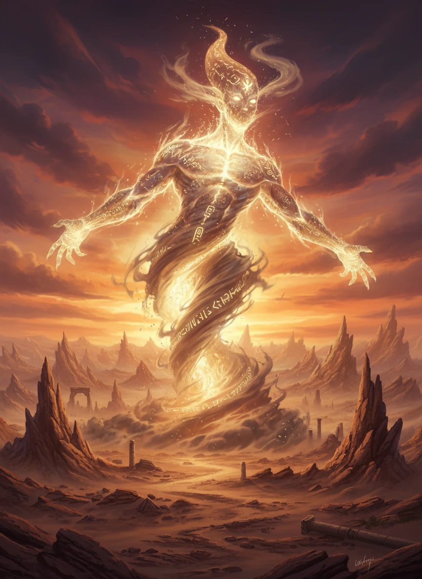 A colossal desert djinn emerges from swirling sands, its form made of light, smoke, and ancient runes. Crafted for a fantasy-art generator, the scene blends mythic scale with warm, sun-drenched tones. Wind-carved ruins and a blazing horizon frame the supernatural presence. mythic fantasy, warm tones, epic scale — NEG: modern objects, blur, low contrast, stiff pose, poor texture, noise, watermark