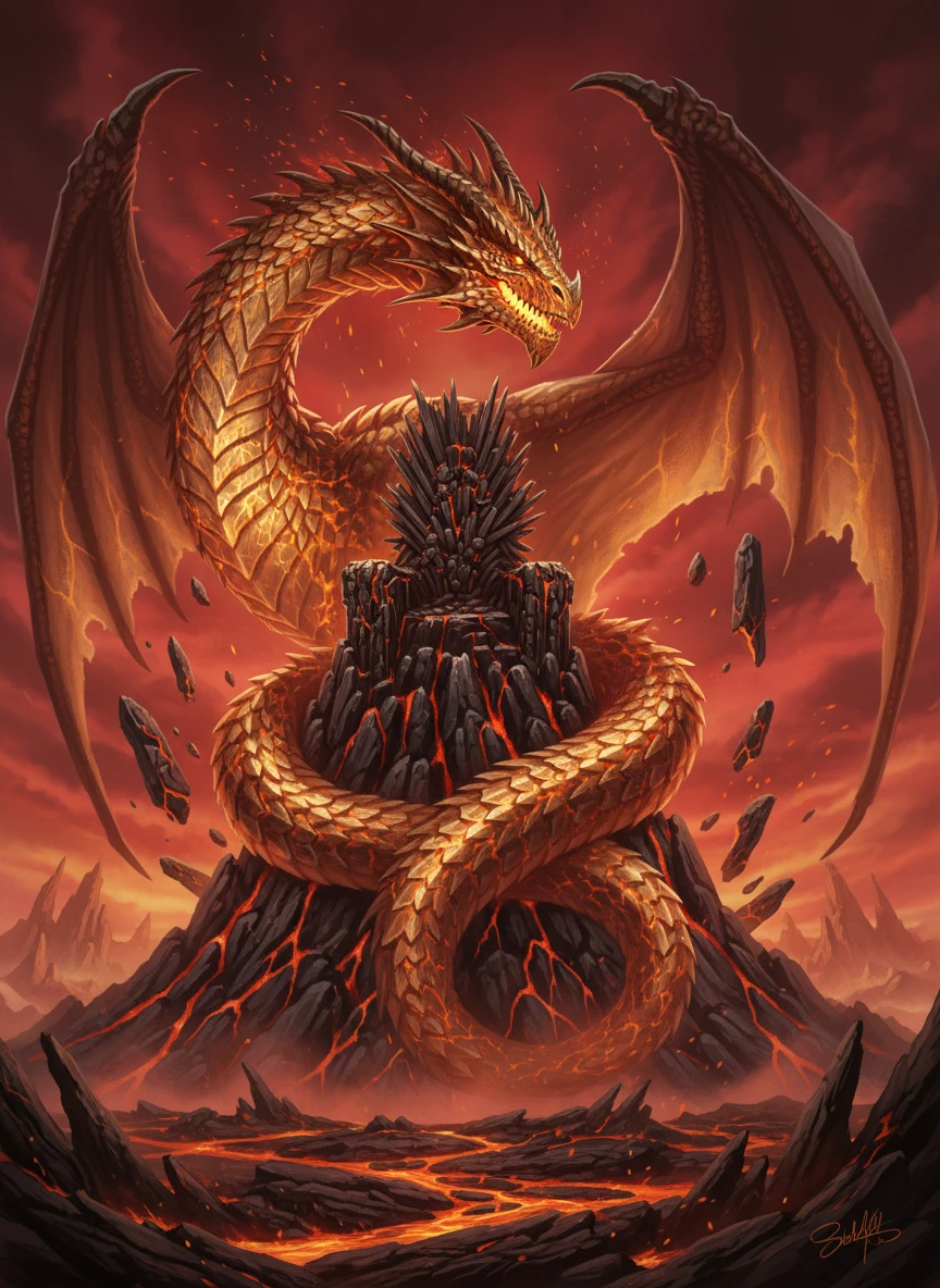 An ancient fire dragon coils around a shattered obsidian throne atop a volcanic peak, its scales glowing like molten gold. The scene is rendered for a fantasy-art generator with dramatic scale, heroic composition, and rich mythical detail. Ash clouds swirl through a crimson sky as embers illuminate the creature’s piercing eyes. epic fantasy, cinematic lighting, ultra-detailed — NEG: blurry, low-res, flat lighting, extra limbs, deformed anatomy, text artifacts, watermark