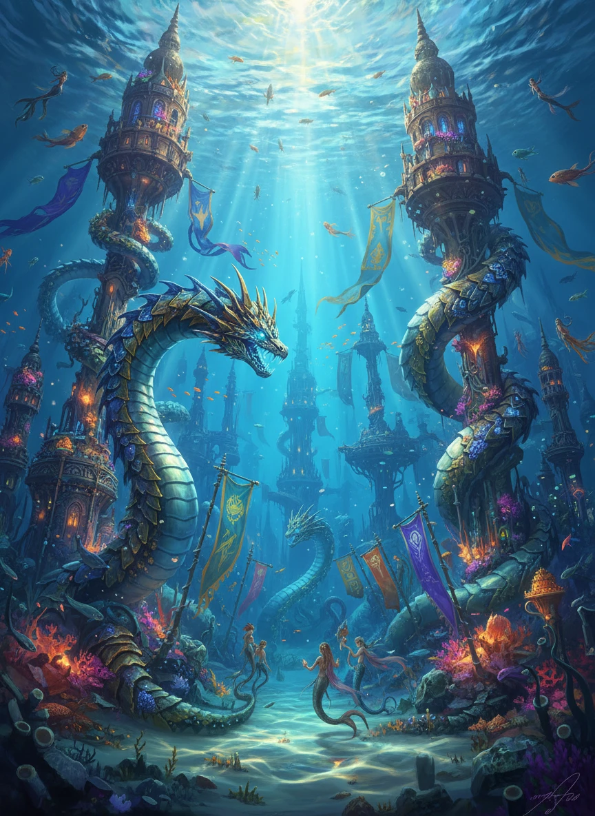 An underwater fantasy kingdom glows beneath a crystal ocean, guarded by armored sea-serpents and coral towers. This fantasy-art generator prompt highlights surreal beauty, fluid motion, and luminous color palettes. Sunbeams pierce the water, illuminating merfolk banners drifting in the currents. underwater fantasy, vibrant colors, surreal — NEG: murky water, washed-out colors, low detail, bubbles clutter, distortion, grain, text