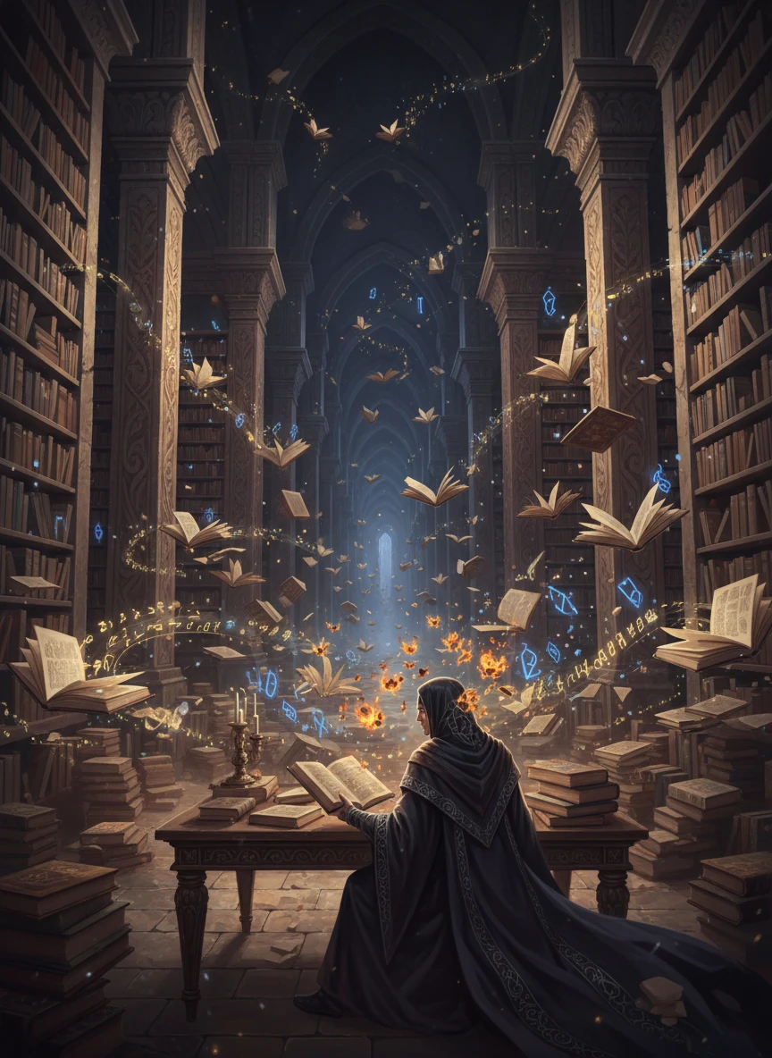 An infinite arcane library stretches into the darkness, where floating books glow and whisper incantations as they rearrange themselves. This fantasy-art generator scene emphasizes ancient magic, scholarly wonder, and surreal depth, with towering shelves carved from stone and light. A lone mage reads at a levitating desk as runes drift through the air like fireflies. high fantasy, mystical atmosphere, detailed interior — NEG: modern objects, flat lighting, blurry text, low resolution, distorted perspective, noise, watermark
