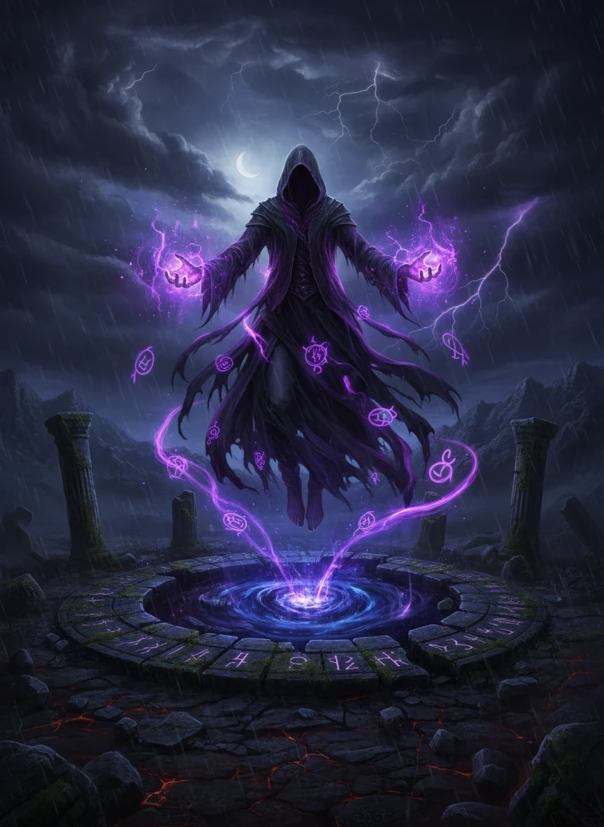 A solitary dark mage floats above a ruined circle of runes, channeling violet energy from the void. Designed as a fantasy-art generator image, the focus is on mystical power, ominous mood, and arcane symbolism. Tattered robes and glowing sigils contrast against a storm-filled night sky. dark fantasy, dramatic contrast, magical effects — NEG: cartoonish, overexposed, blurry face, extra fingers, poor anatomy, flat background, artifacts