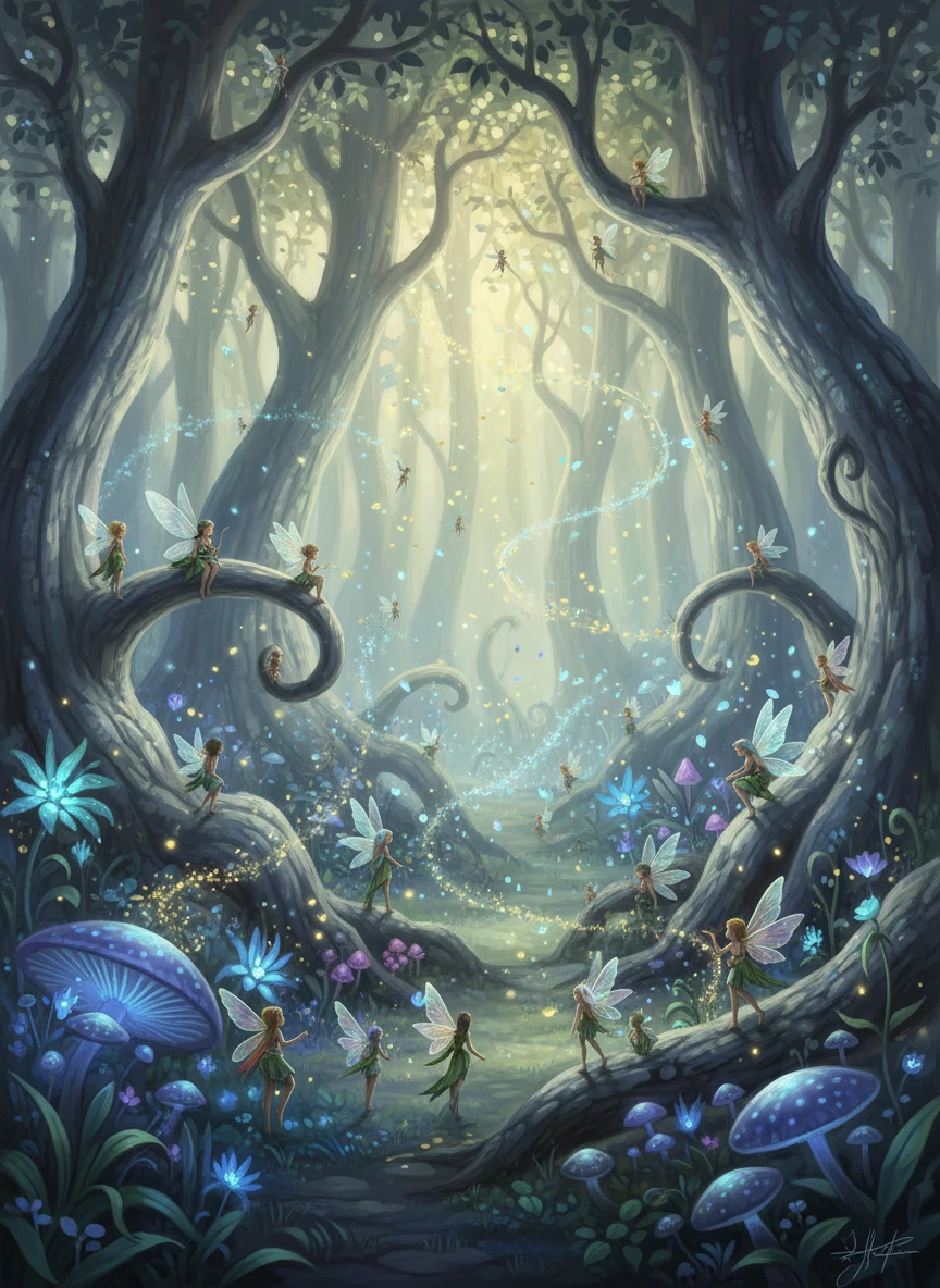 Tiny winged fairies gather in a glowing forest clearing surrounded by ancient trees and bioluminescent flowers. Designed for a fantasy-art generator, the image focuses on delicate scale, soft light, and enchanted atmosphere. Floating pollen lights the air like living stardust. whimsical fantasy, soft lighting, magical — NEG: harsh shadows, dull palette, low detail, exaggerated faces, blur, noise, watermark