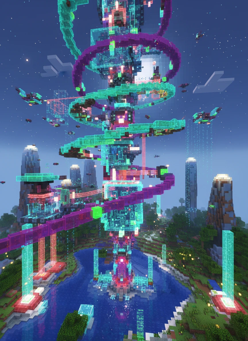futuristic minecraft world ai generated neon blocks advanced redstone design glowing elements