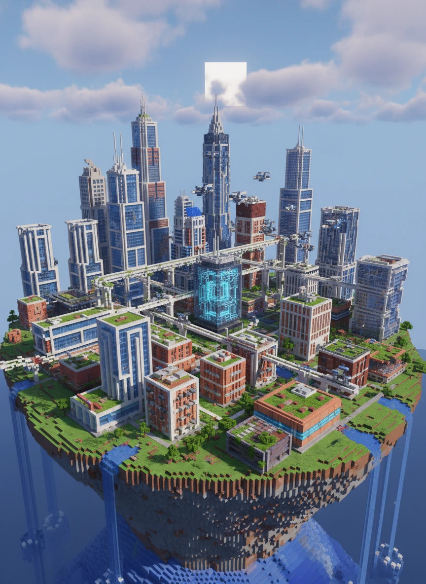 minecraft ai generated city modern skyscrapers block style high resolution clean daylight