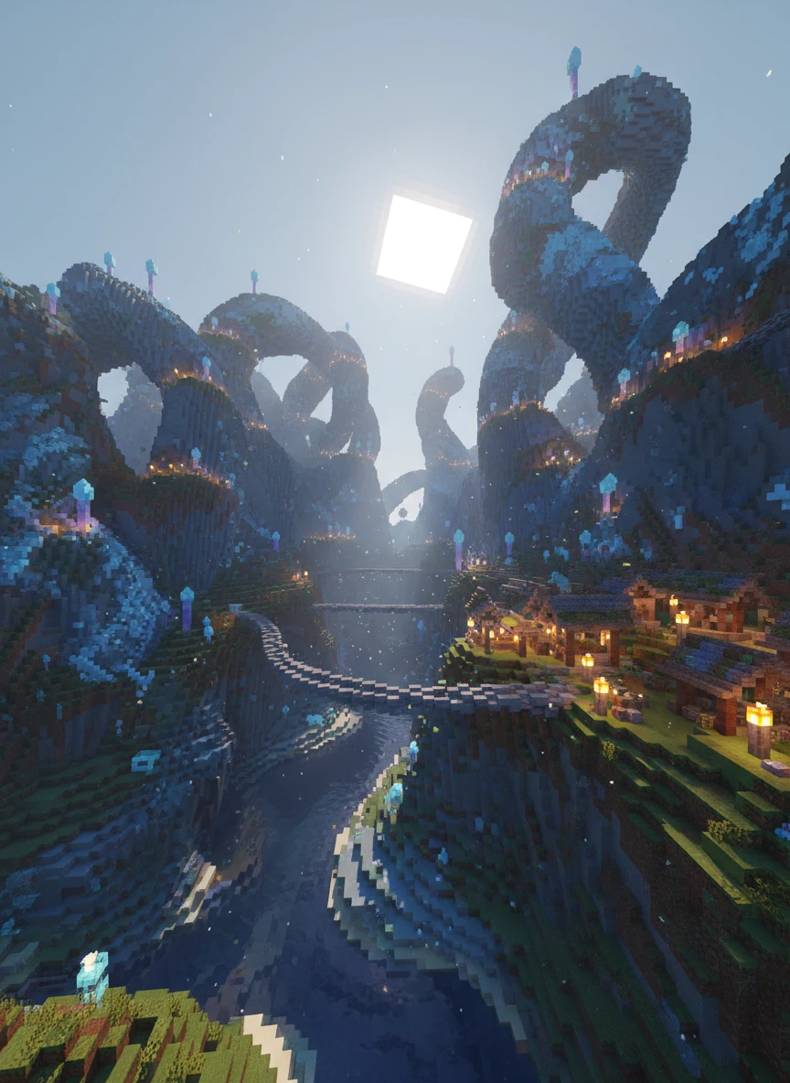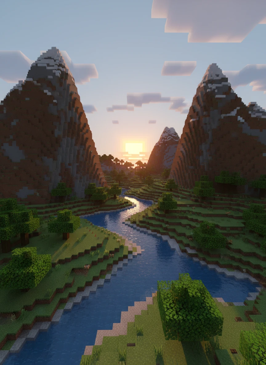 ai minecraft generator mountain landscape rivers valleys sunrise golden light atmospheric depth