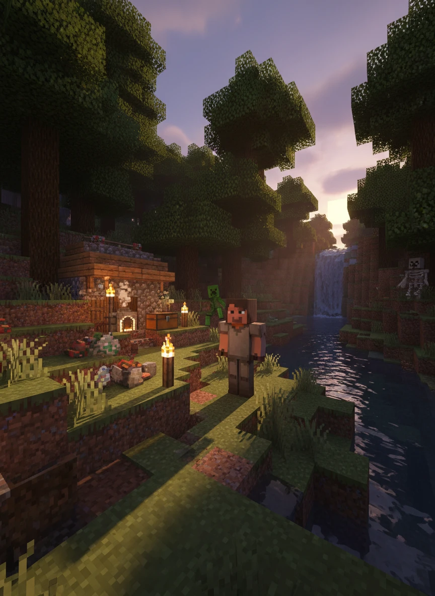 ai generated minecraft scene custom procedural terrain blocks dynamic lighting wide angle environment depth