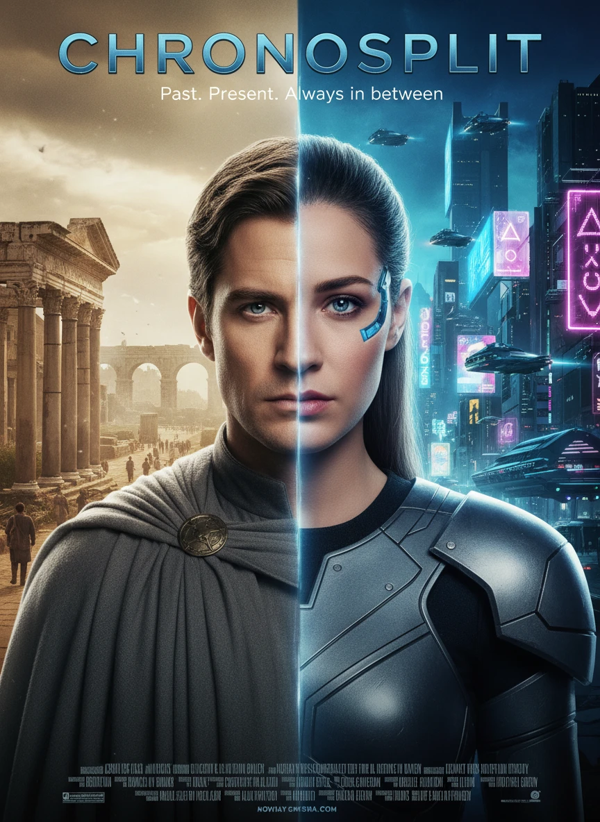 Design a time-travel movie poster generator concept showing a character split between two eras, one side futuristic and the other historical. Use visual contrast and seamless blending to communicate the theme. The layout should clearly read as a high-concept cinematic poster. Style: sci-fi drama, conceptual, cinematic NEG: confusing composition, low detail, muddy colors, blur, incorrect proportions, watermark, artifacts