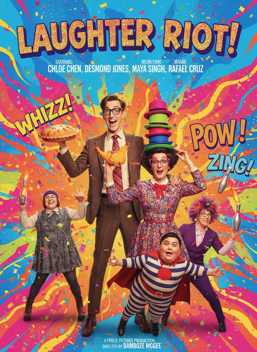 Design a colorful comedy movie poster generator visual with a group of quirky characters striking exaggerated poses against a bright background. The mood should be playful, energetic, and instantly humorous. Use a clean layout with space for a bold title and cast names. Style: comedy, vibrant colors, playful NEG: dark mood, realism, muted colors, awkward faces, blur, watermark, artifacts