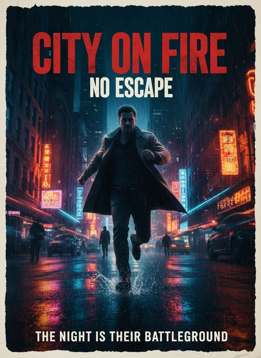 Design a gritty action–thriller movie poster generator scene set in a rain-soaked city at night, with a shadowy hero running between neon-lit streets. Use dynamic motion, dramatic perspective, and strong color contrast to convey urgency. The poster should look suitable for a theatrical release with bold typography areas. Style: neo-noir, action thriller, dynamic motion NEG: cartoonish, dull colors, overexposed, bad proportions, messy background, watermark, noise