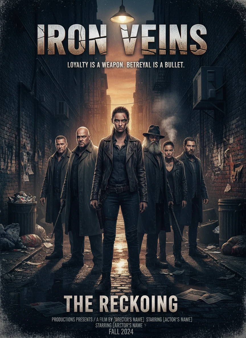 Create a crime drama movie poster generator image featuring a group of tough-looking characters standing in an urban alley at dusk. Use strong shadows, gritty textures, and intense expressions to convey power and conflict. Present it in a polished theatrical poster format. Style: crime drama, gritty realism, cinematic NEG: soft lighting, cheerful mood, cartoon look, blur, extra limbs, watermark, low resolution