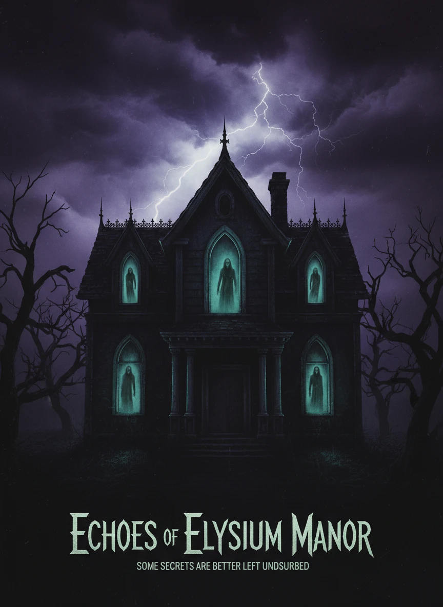 Create a horror-themed movie poster generator image of an old mansion looming under a stormy sky, with faint ghostly silhouettes in the windows. The mood should be dark, suspenseful, and unsettling, using shadows and eerie lighting. Arrange elements like a traditional theatrical horror poster. Style: horror, dark atmosphere, gothic NEG: bright colors, friendly expressions, flat lighting, low detail, cartoon style, watermark, artifacts